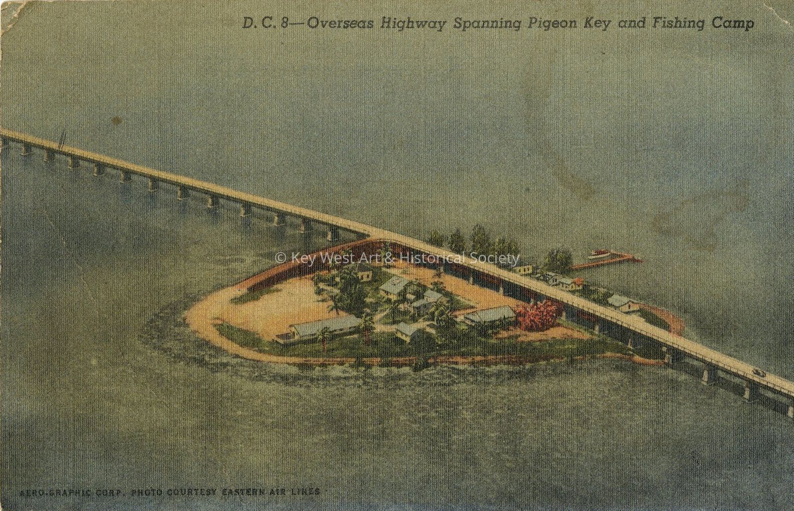 Postcard depicting Overseas Highway spanning Pigeon Key and Fishing Camp. The longest span of the Overseas Highway is the seven mile portion which spans Pigeon Key. On this small island about midway between Miami and Key West, is located a popular fishing camp.Collection