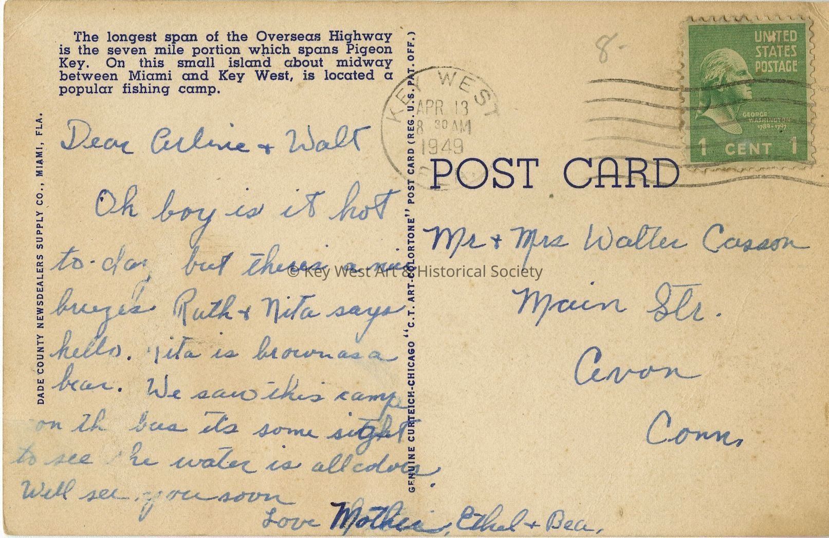 Dear Arline & Walt, Oh boy is it hot to-day, but there's a nice breeze. Ruth & Nita says hello. Nita is brown as a bear. We saw this camp from the but it's some sight to see. The water is all colors. Well see you soon. Love, Mother, Ethel & BeaDimensions
