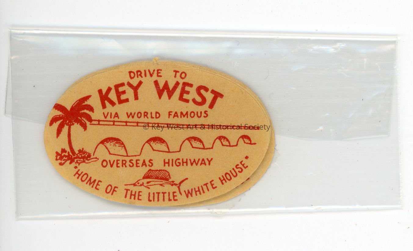Pack of ten yellow stickers with red text, 'Drive to Key West via World Famous Overseas Highway - Home of the Little White House'. Stickers are contained in a small plastic bag that is taped shut.Collection