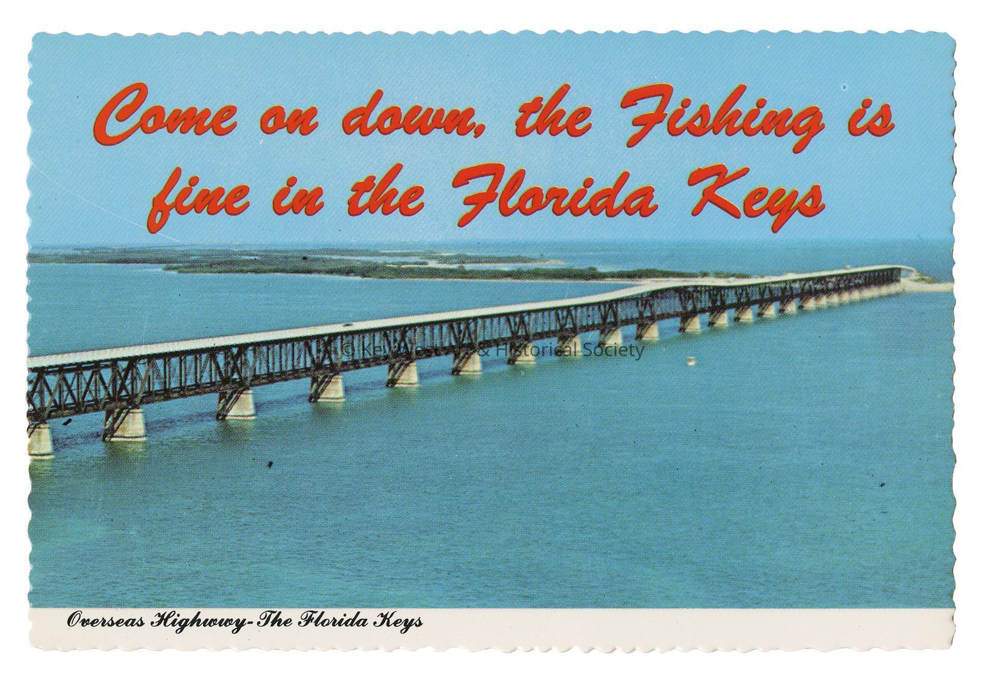 Scallop-edged postcard depicting the old Bahia Honda bridge. Caption reads, 'Come on down, the Fishing is fine in the Florida Keys'. Notation on verso, 'Bahia Honda, highest span in the Overseas Highway system to Key West, Florida.'Subject Place
