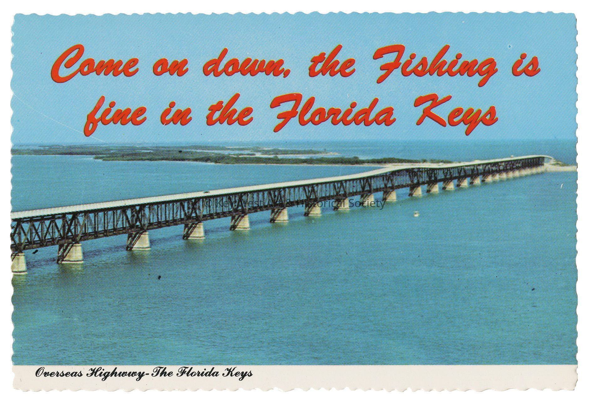 Scallop-edged postcard depicting the old Bahia Honda bridge. Caption reads, 'Come on down, the Fishing is fine in the Florida Keys'. Notation on verso, 'Bahia Honda, highest span in the Overseas Highway system to Key West, Florida.'Subject Place