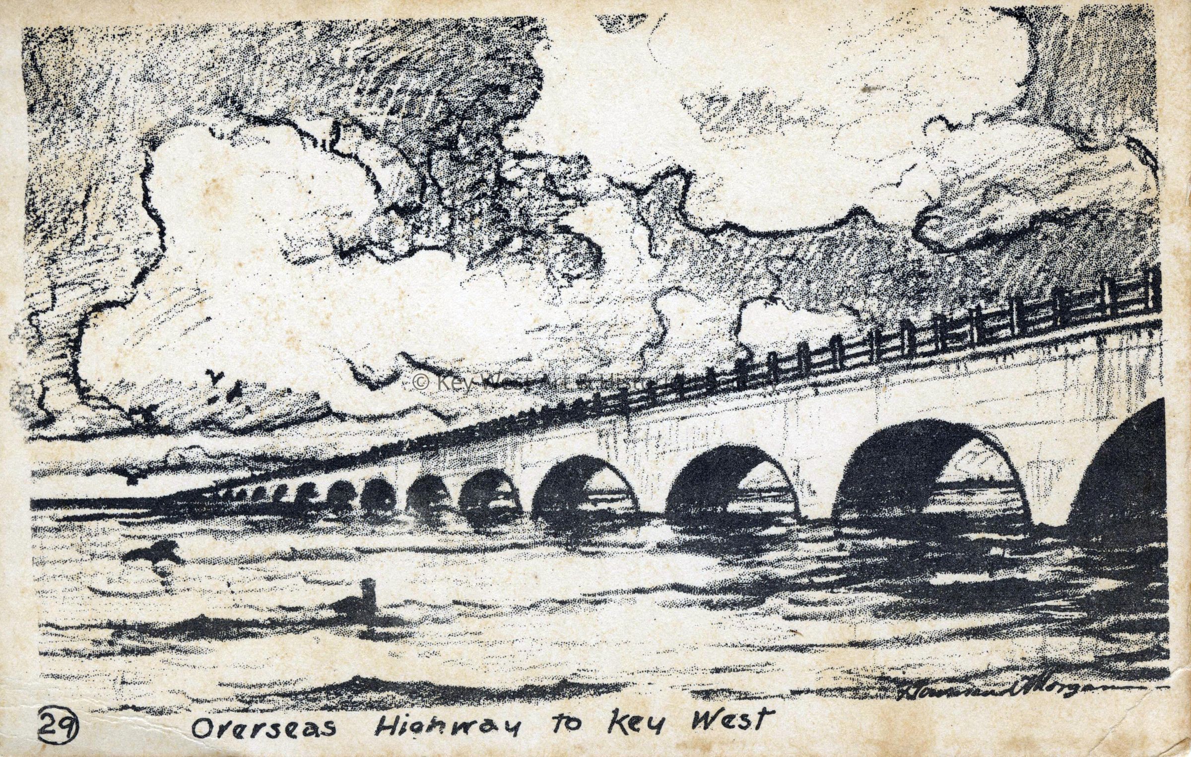 Postcard depicting the Overseas Highway to Key West taken from a lithograph by Franklin Townsend Morgan. The caption reads, 'Overseas Highway to Key West’.Collection