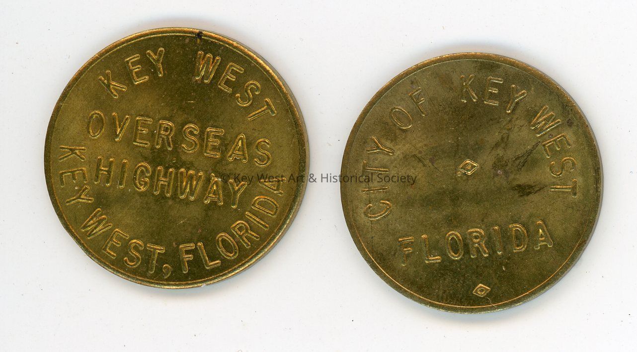 Brass coin intended to be a toll token for driving on the the Overseas Highway to Key West. One side of the coin reads 'KEY WEST OVERSEAS HIGHWAY KEY WEST, FLORIDA' and the other reads 'CITY OF KEY WEST FLORIDA.'Collection