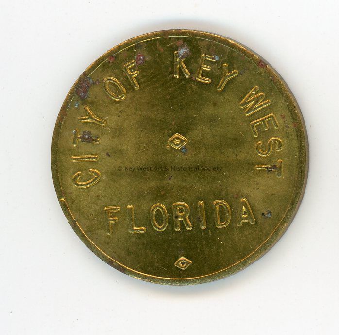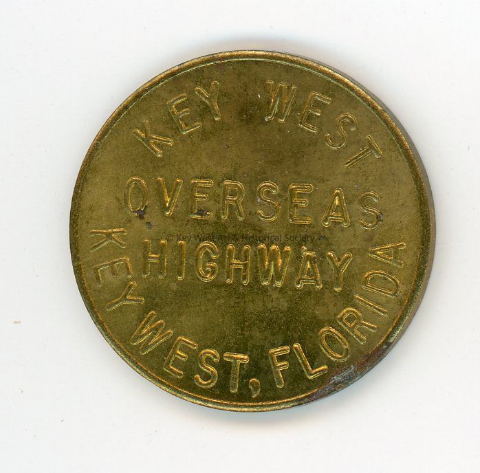 Brass coin used as a toll token for driving on the Overseas Highway to Key West. The recto reads 'Key West Overseas Highway Key West, Florida' and the verso reads 'City of Key West Florida.'Collection