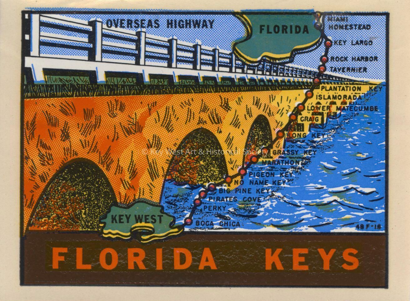 A travel decal created by the Impko company depicting the Overseas Highway with a map of the Florida Keys superimposed over it.Collection