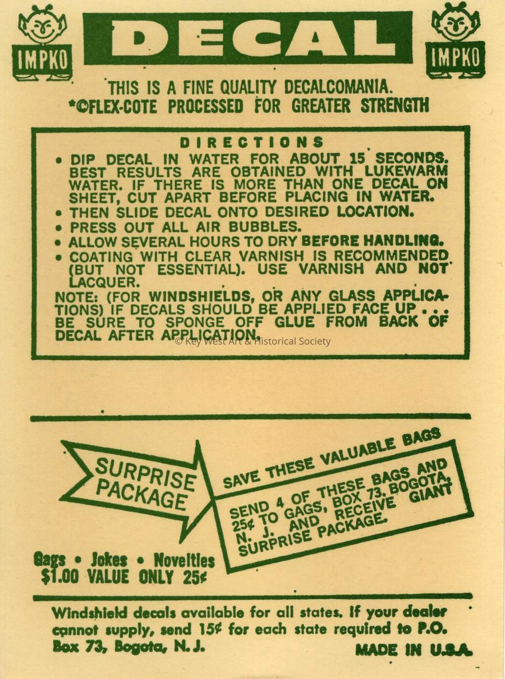 Instructions that accompanied the travel decal created by the Impko company depicting the Overseas Highway with a map of the Florida Keys superimposed over it.Collection