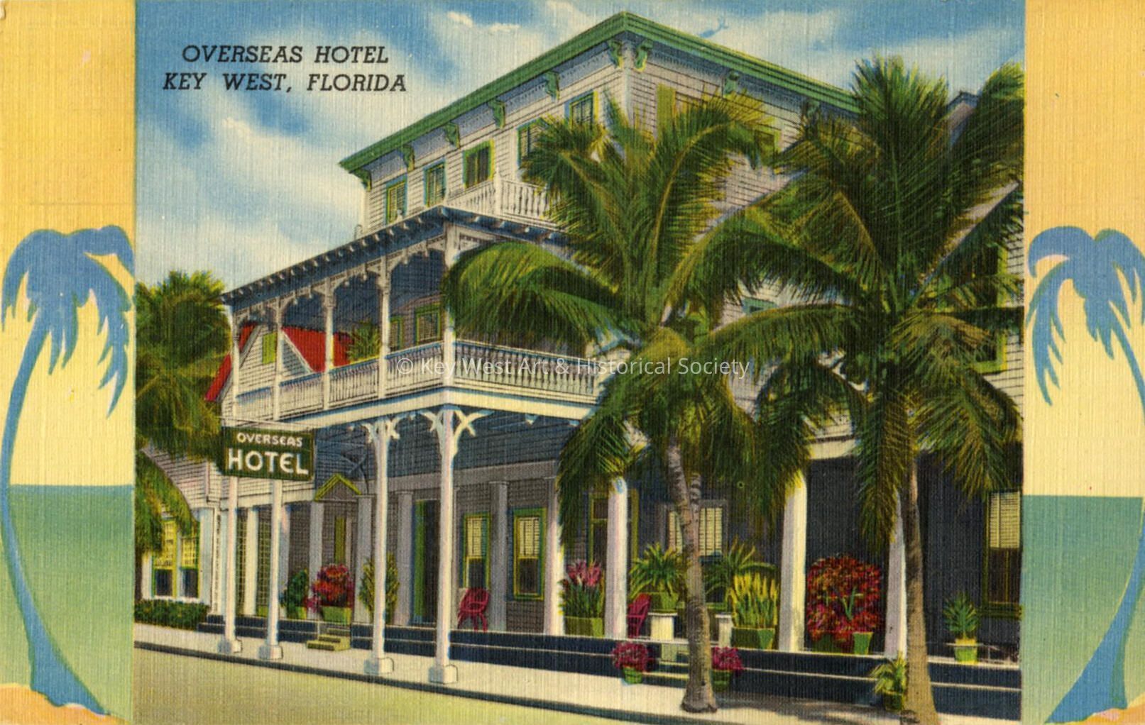 Postcard depicting the Overseas Hotel on Fleming Street. The caption reads, ‘Overseas Hotel Key West, Florida.' The description on the verso reads, 'Overseas Hotel. Key West, Florida. Large modern rooms...private baths...reasonable rates...'Enjoy the cool breezes on Key West's largest veranda'...a fisherman's paradise...dining room - cocktail lounge'.Subject Place