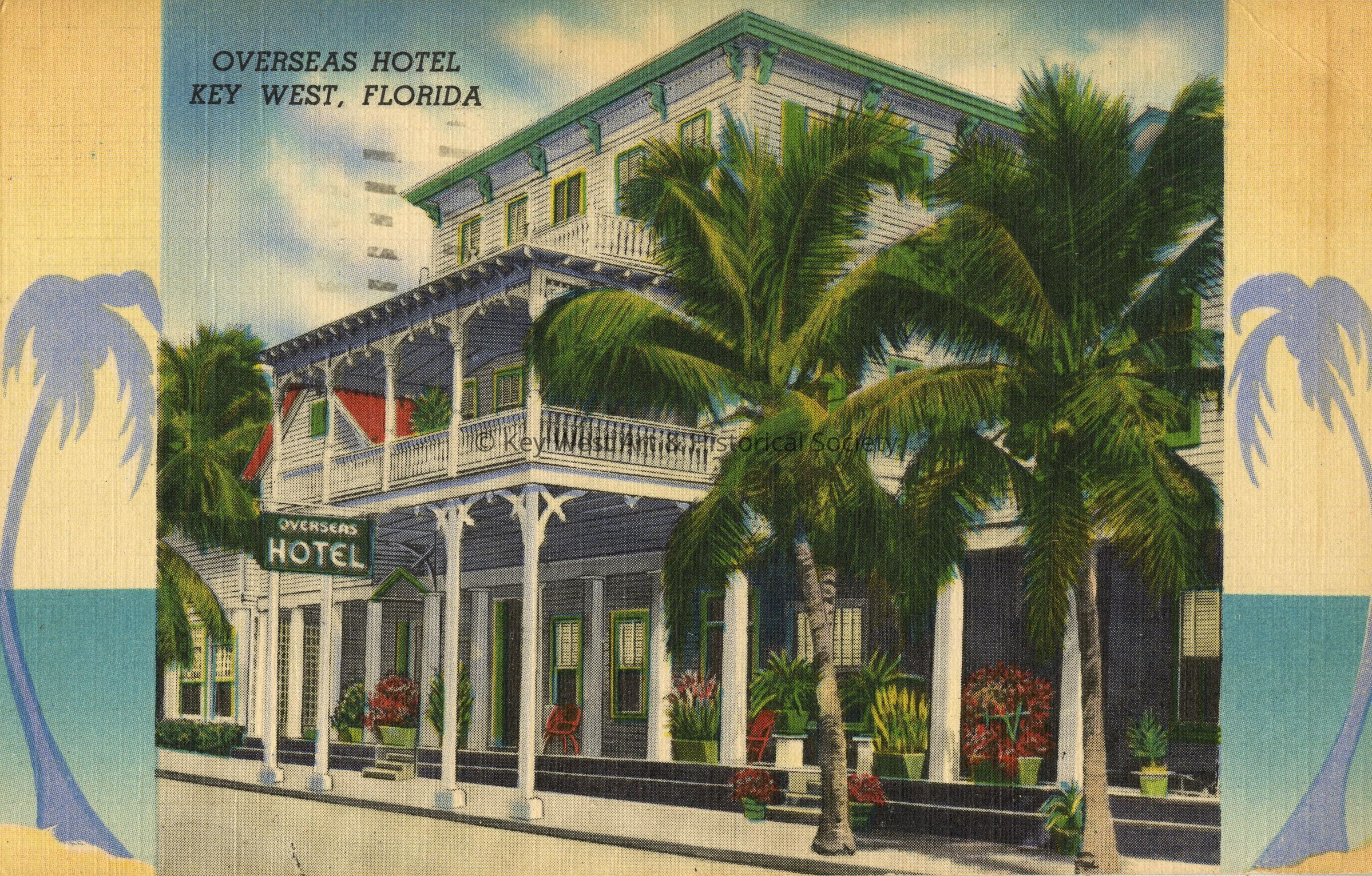 Postcard depicting the Overseas Hotel on Fleming Street. The caption reads, ‘Overseas Hotel Key West, Florida.' The description on the verso reads, 'Overseas Hotel. Key West, Florida. Large modern rooms...private baths...reasonable rates...'Enjoy the cool breezes on Key West's largest veranda'...a fisherman's paradise...dining room - cocktail lounge'.Subject Place