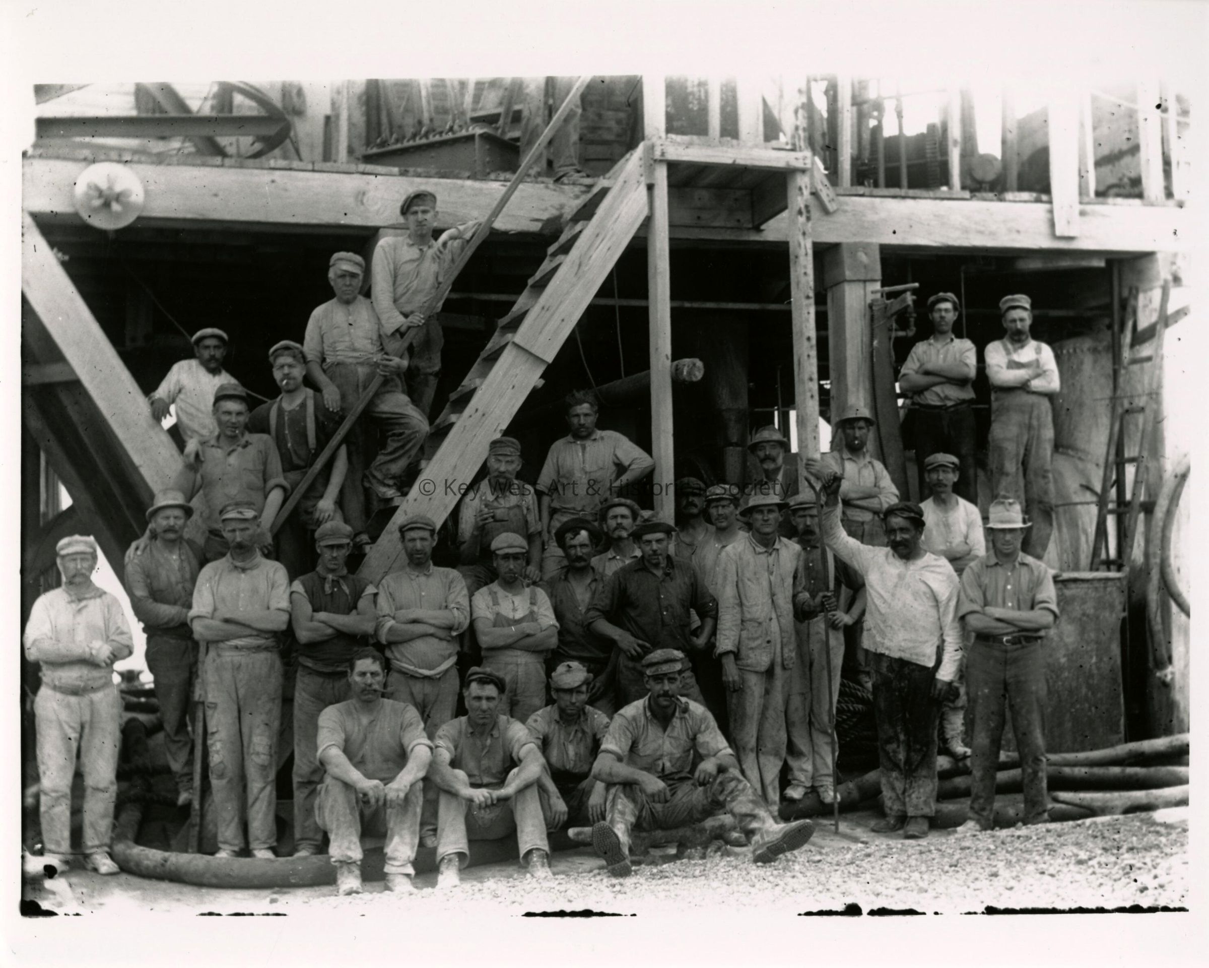 Black and white print taken from a dry plate glass negative of unknown workers building the Seven Mile Bridge. The image was taken during the construction of Seven Mile Bridge on the Overseas Railway.