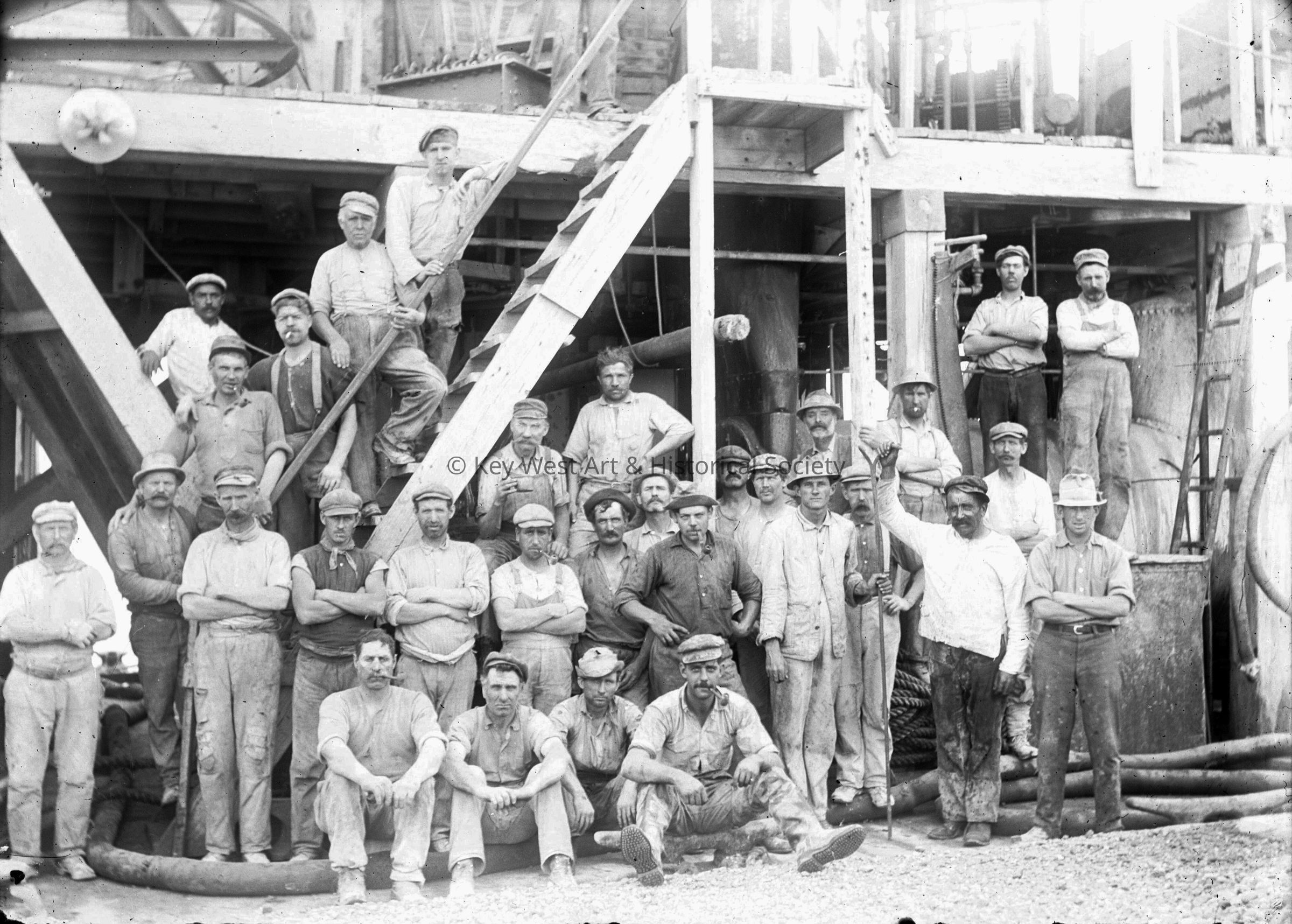 Black and white dry plate glass negative of unknown workers building the Seven Mile Bridge. The image was taken during the construction of Seven Mile Bridge on the Overseas Railway.