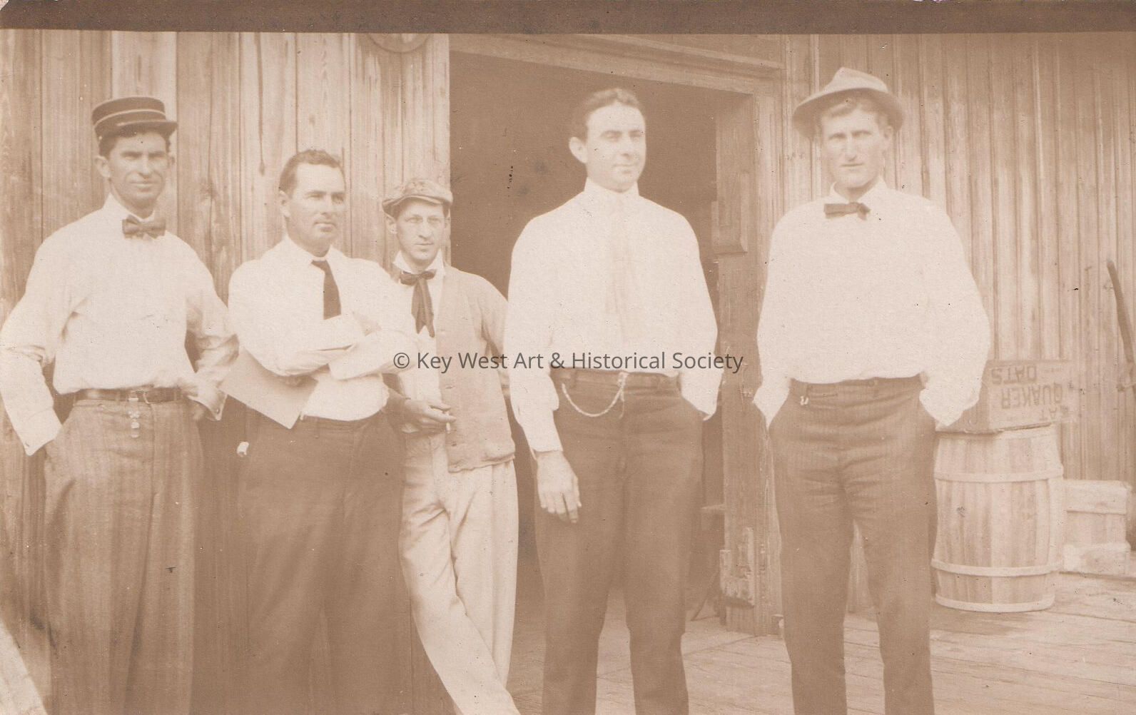 Postcard of five men in front of a warehouse. The message on the verso reads, 'Keene - Front Agent Marathon; Tucker; Scipla; McCormick; Hawkins. In front of Store Room. 1911'.Subject Person/Organization