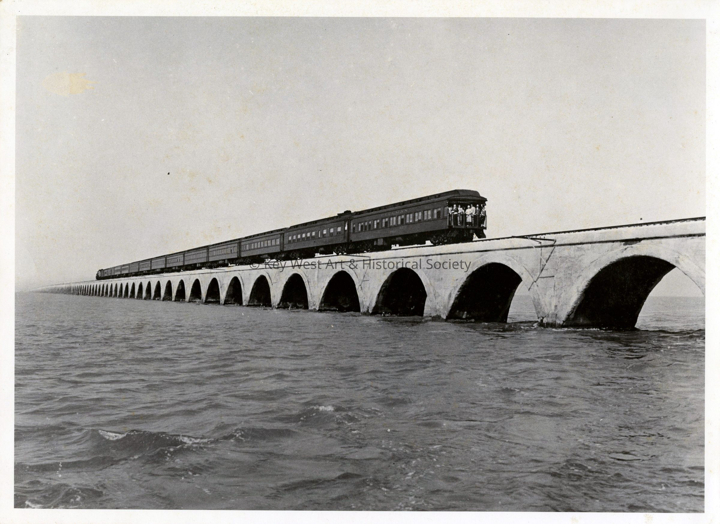 Black and white photograph of an Overseas Railway train crossing Long Key Viaduct. Passengers are standing at the rear of the train.
