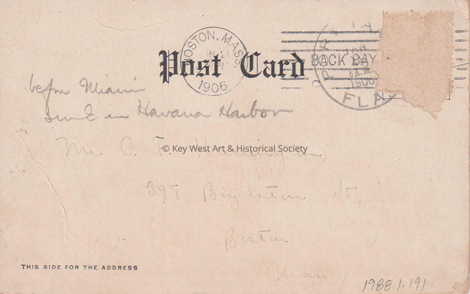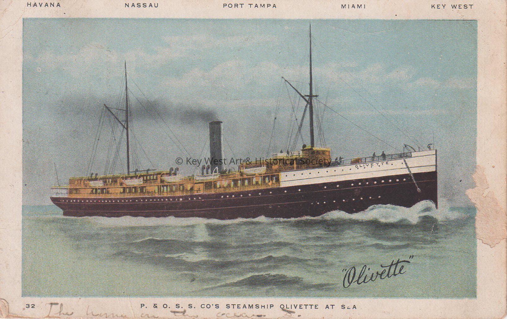 Postcard depicting the steamship OLIVETTE at sea. The caption reads, ‘Havana, Nassau, Port Tampa, Miami, Key West. P & O S.S. Co.'s Steamship Olivette at sea.’ A note on the front reads, ‘The home on the ocean.’ The message on the verso reads, 'Before Miami sunk in Havana Harbor'. The card is addressed to Mr. C.F. Harrington, 398 Boylston Street, Boston, Massachusetts, and is postmarked Boston, January 21, 1906.Collection