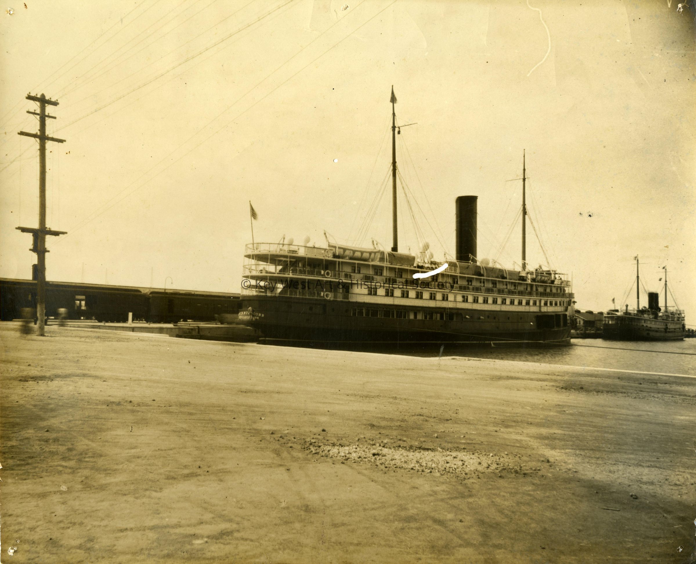 Black and white photograph of Peninsular & Occidental steamship S.S. GOVERNOR COBB alongside a train at the Florida East Coast Railway depot in Key West.