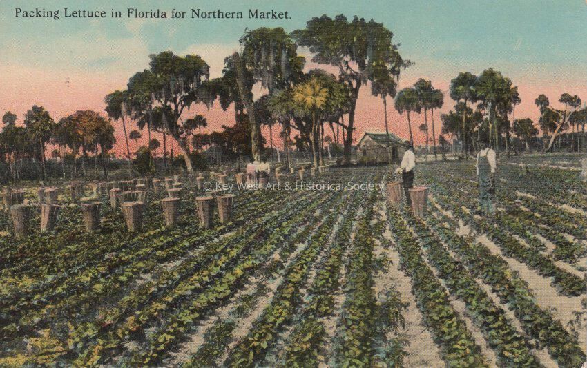 Postcard depicting men picking lettuce with Spanish moss-draped trees in the background. The caption reads, ‘Packing Lettuce in Florida for Northern Market.’Collection
