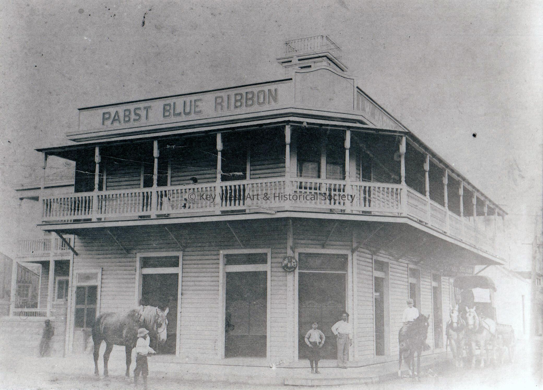 Man and horses in front Padron's Grocery formerly located at 800 Whitehead Street. Pabst Blue Ribbon is advertised along the top of the store. A fire destroyed the building in March 1971.