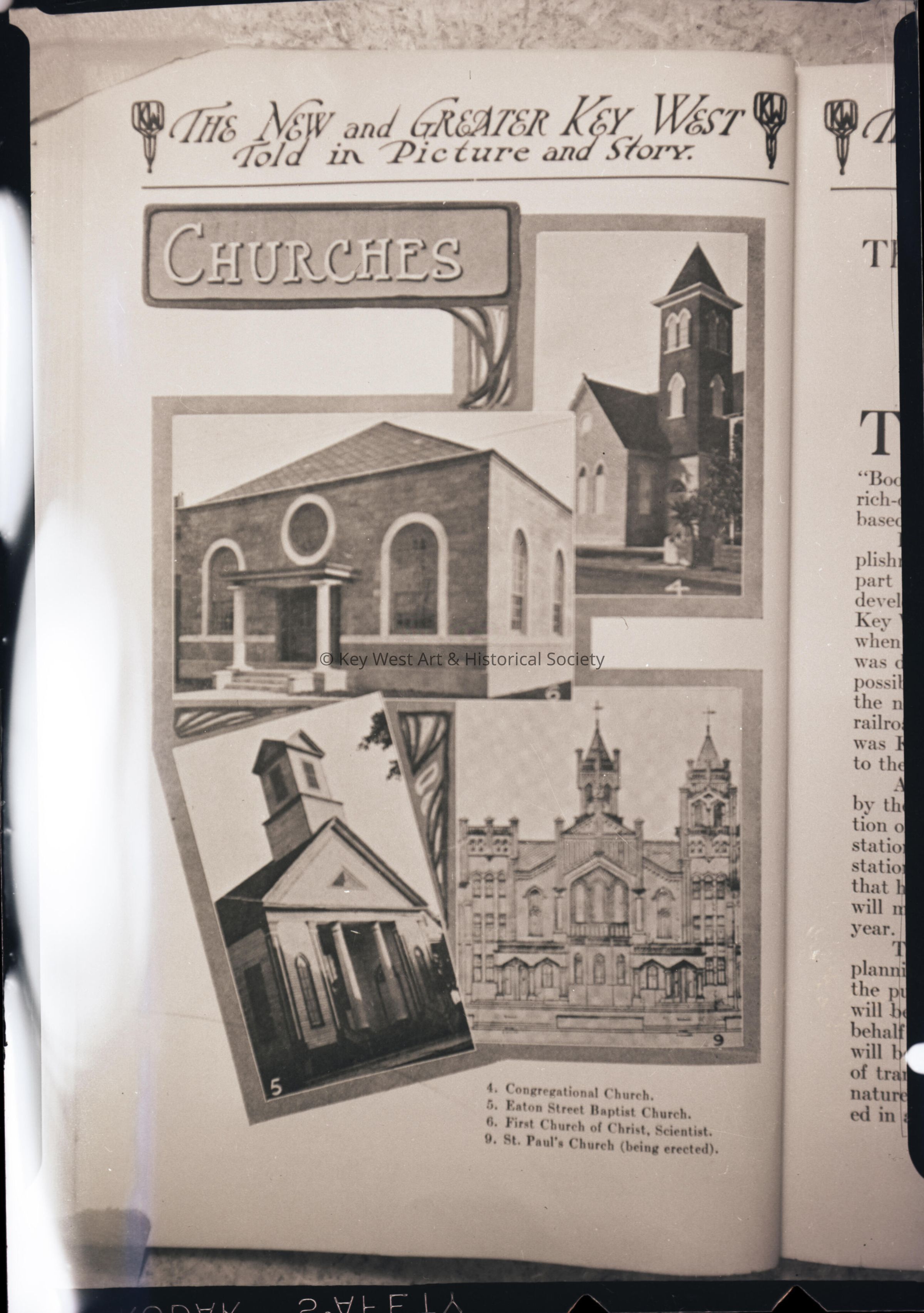 Photographic negative depicting a page from 'The New and Greater Key West Told in Picture and Story' showing Key West Churches.