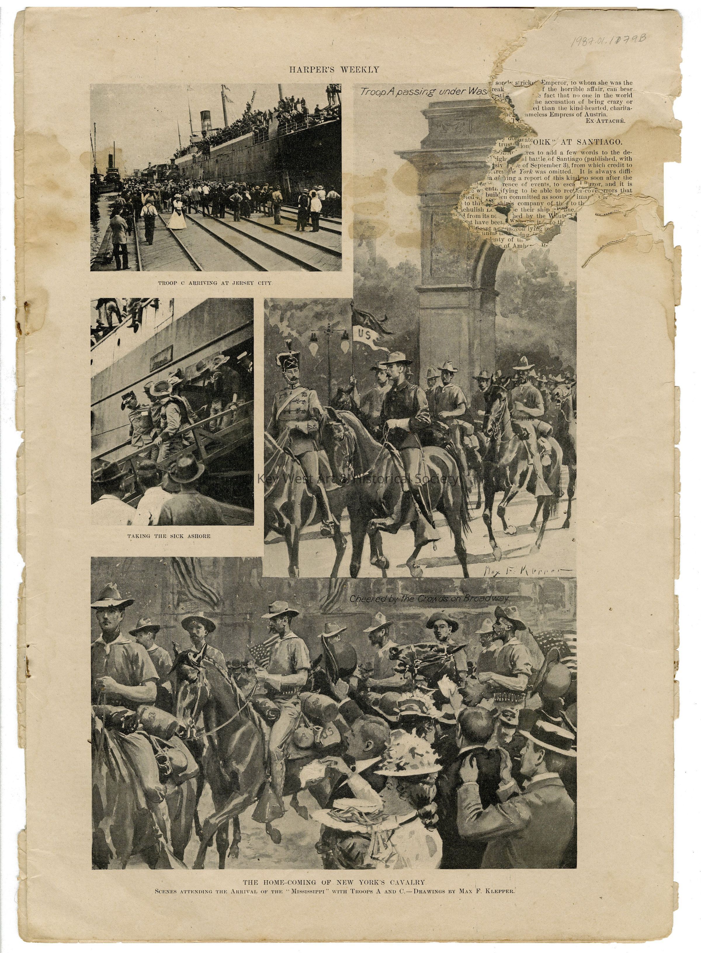 Several pages from two editions of Harper's Weekly with coverage during the Spanish-American War.