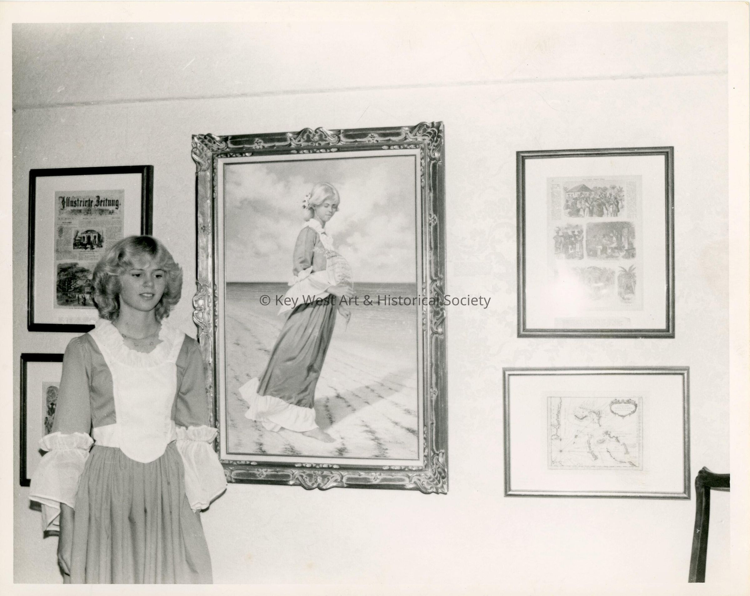 Black and white photograph of a costumed woman standing alongside a painting by Alton Lowe. The painting hangs in the Albert Lowe Museum, New Plymouth, Green Turtle Cay, Abaco, Bahamas.Photograph Details