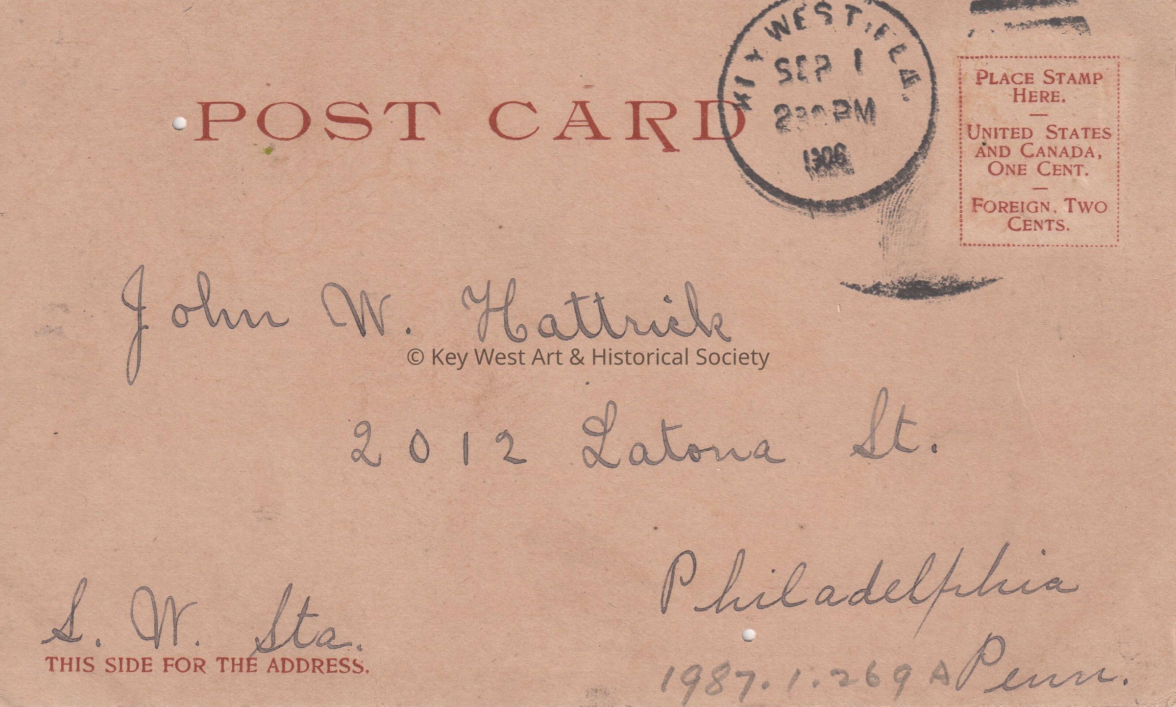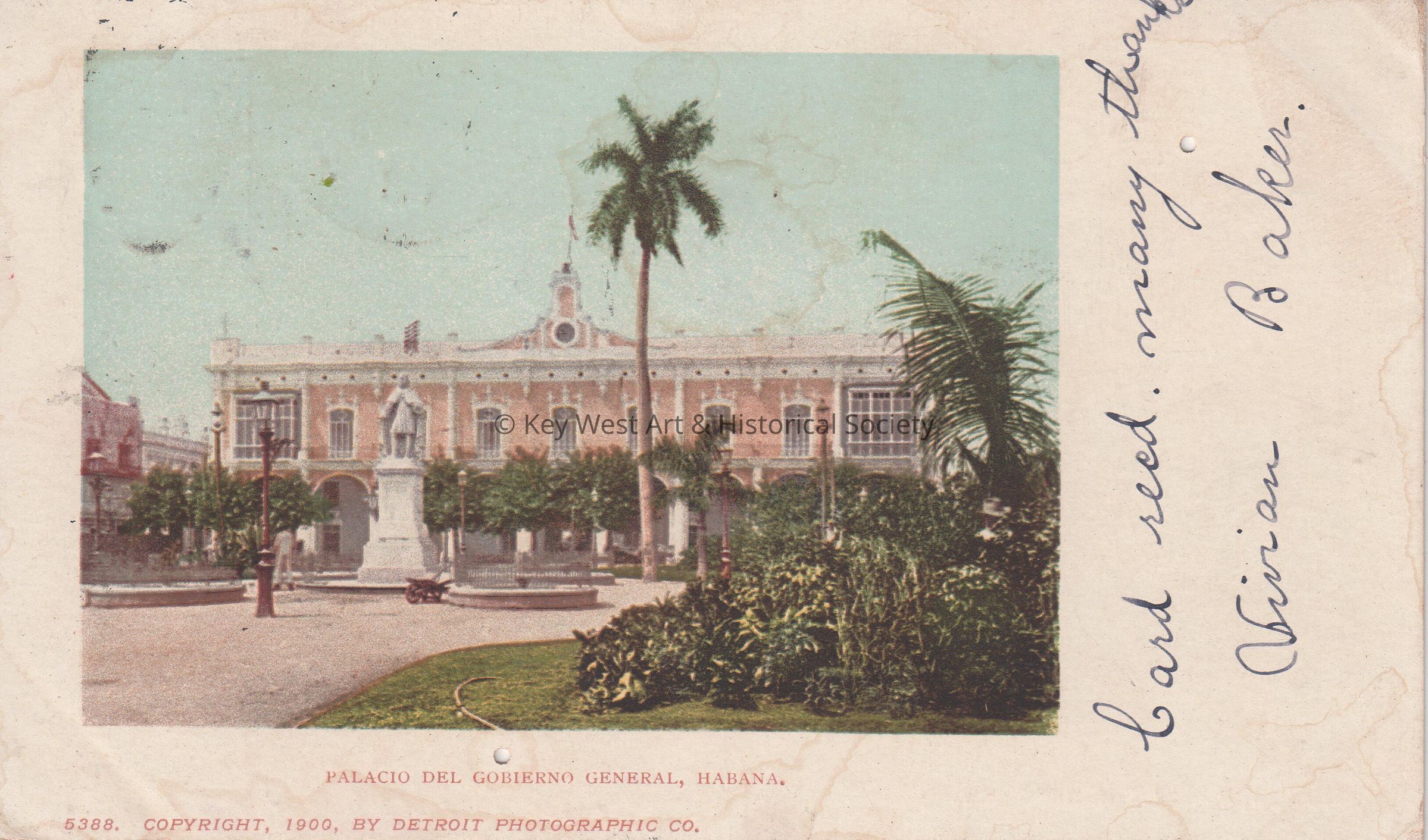 Postcard depicting a large building with a statue and palm trees in front. The caption reads, ‘Palacio Del Gobierno General, Habana.’ The message on the front reads, ‘Card received, many thanks, Vivian Baker'. The card is addressed to John W. Hattrick, 2012 Latona Street, Philadelphia, Pennsylvania, Southwest Station, and is postmarked Key West, September 1, 1906.Collection