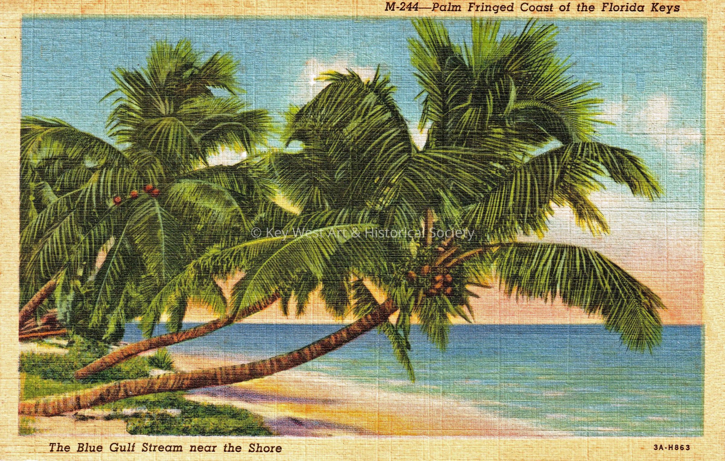 Postcard depicting palm trees outstretched toward the ocean. The caption reads, ‘Palm fringed coast of the Florida Keys. The blue gulf steam near the shore’.Collection
