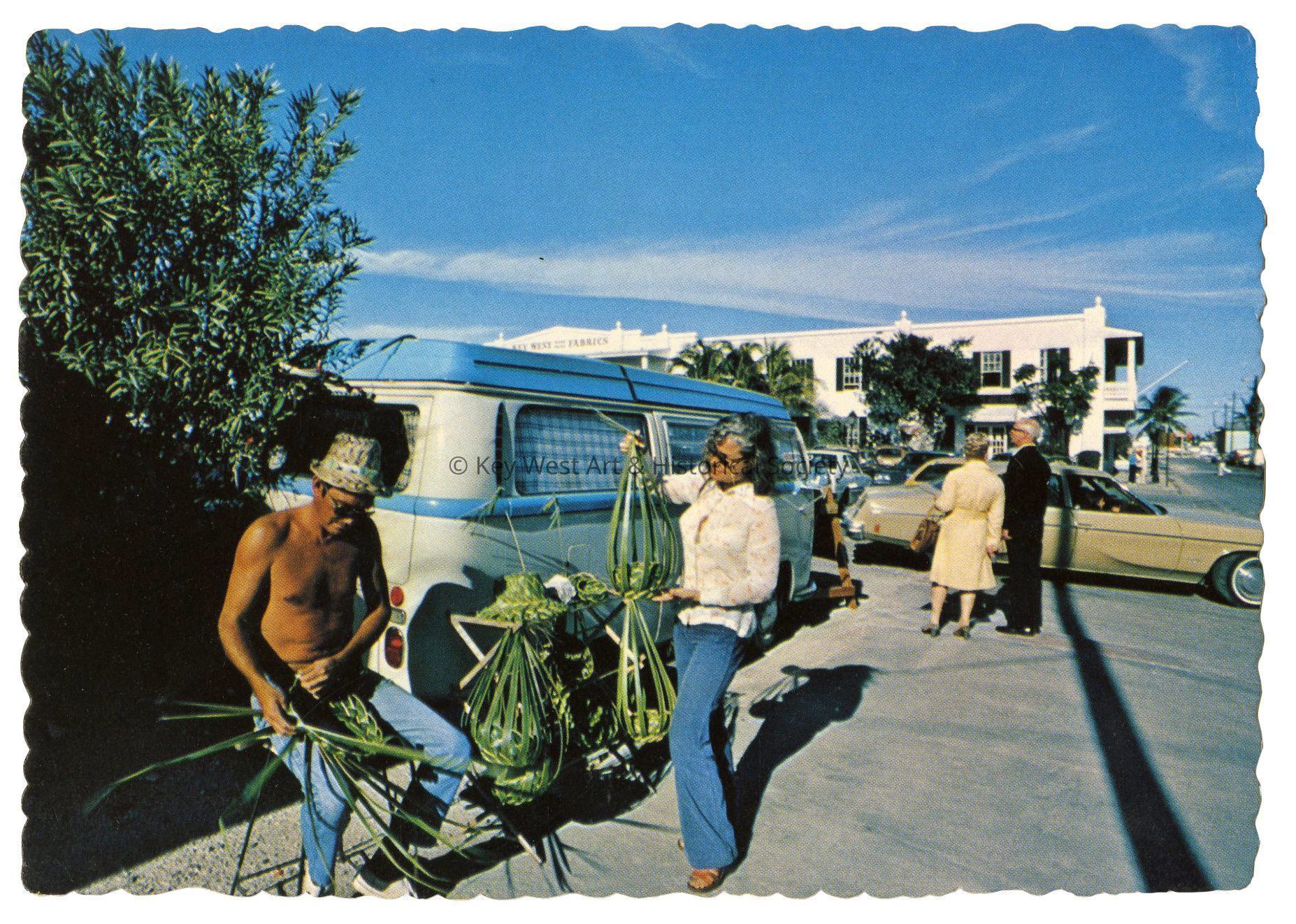 Postcard depicting a man weaving palm fronds into hats and baskets outside of the Key West Hand Print Building on Front Street. Notation on verso, 'Cool tropical hats, made from Coconut palm, are woven by sidewalk craftsmen. Key West, Fla.'Subject Place