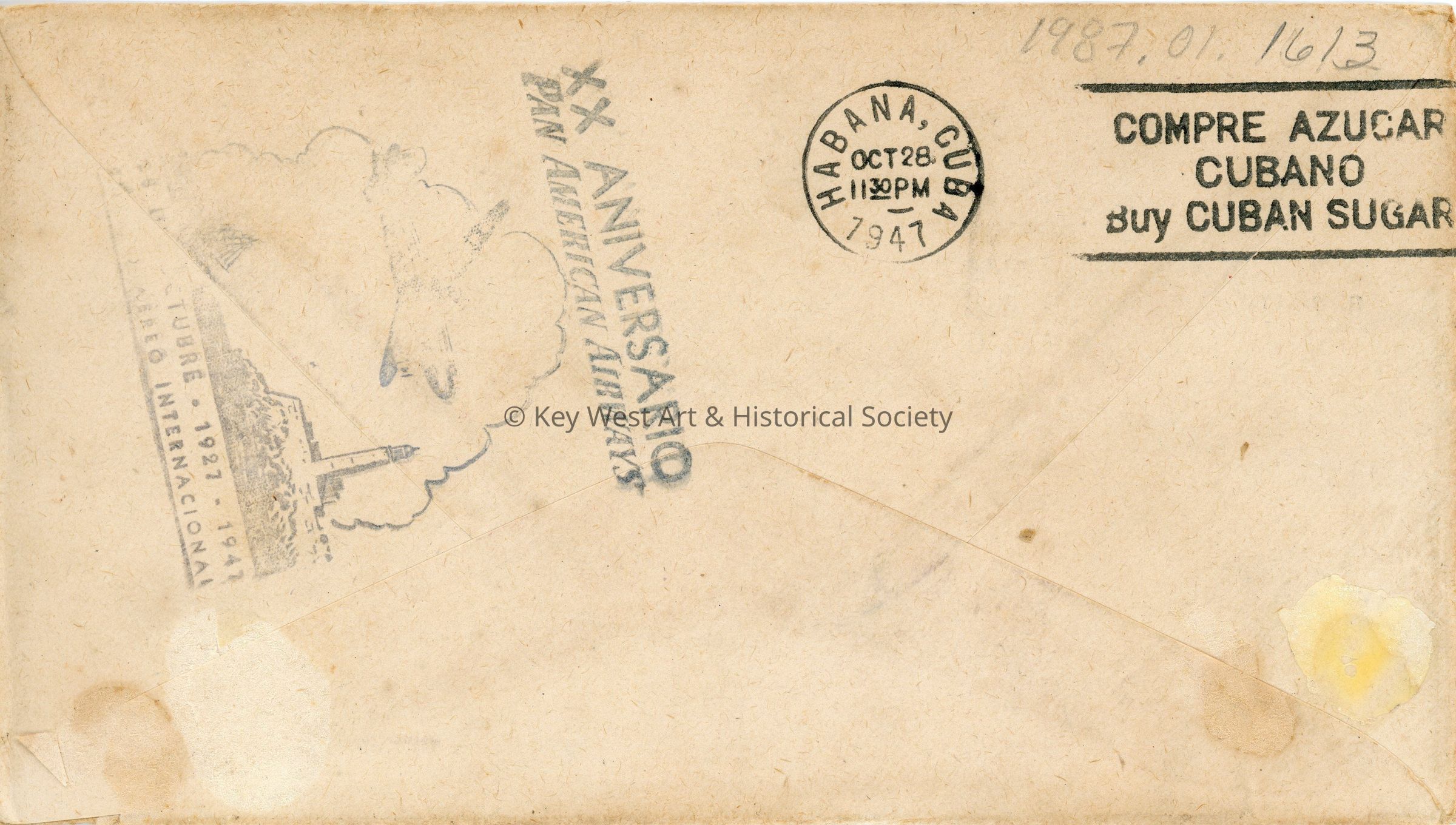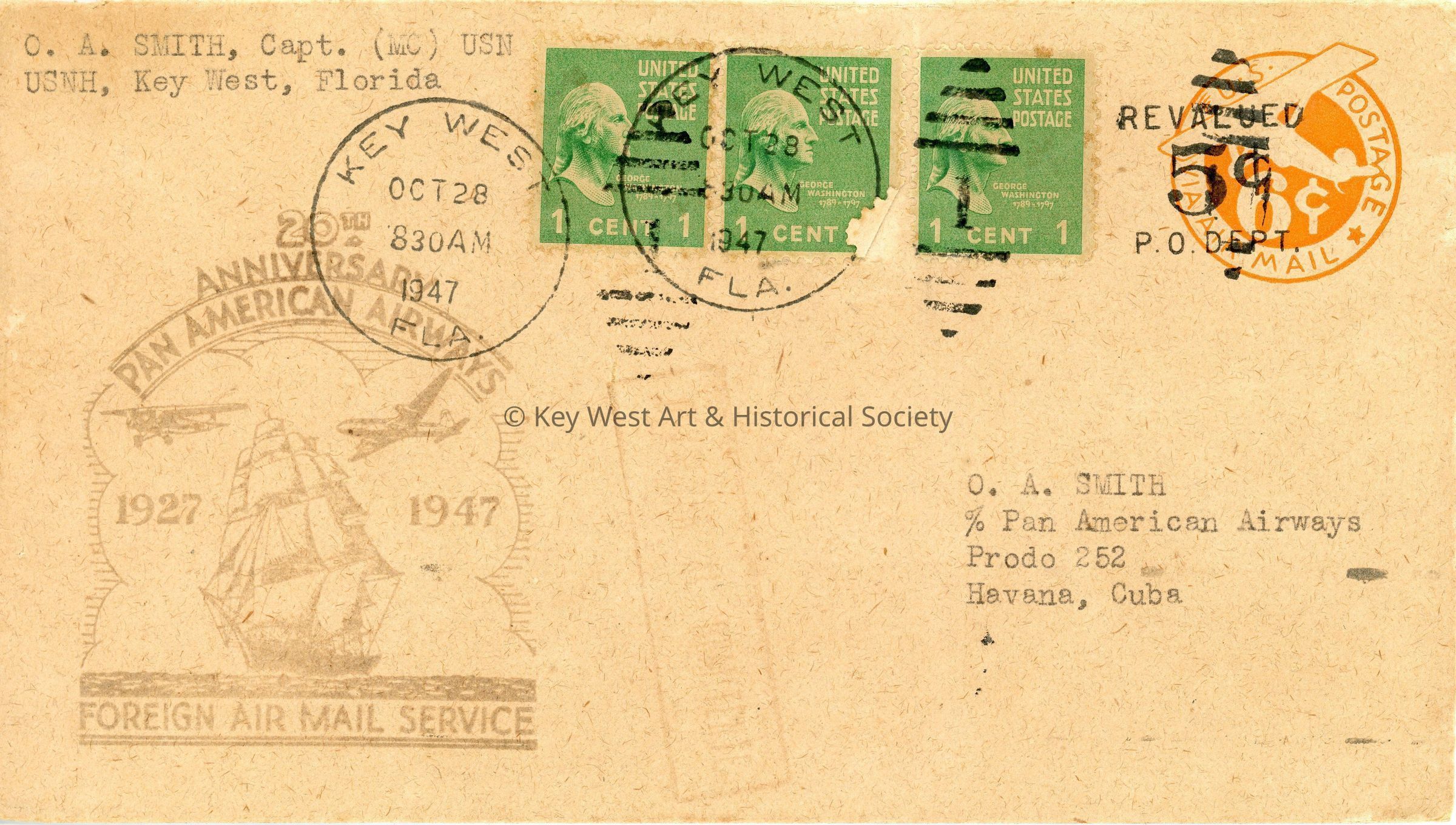 An envelope dated October 28, 1947 with stamps commemorating the 20th anniversary of the first regularly scheduled international postal flight between Key West and Havana, Cuba which gave rise to Pan American World Airways. The envelope is addressed to 'O.A. Smith c/o Pan American Airways Prodo 252 Havana, Cuba' from 'O.A. Smith, Capt. (MC) USN USNH, Key West, Florida.'Collection