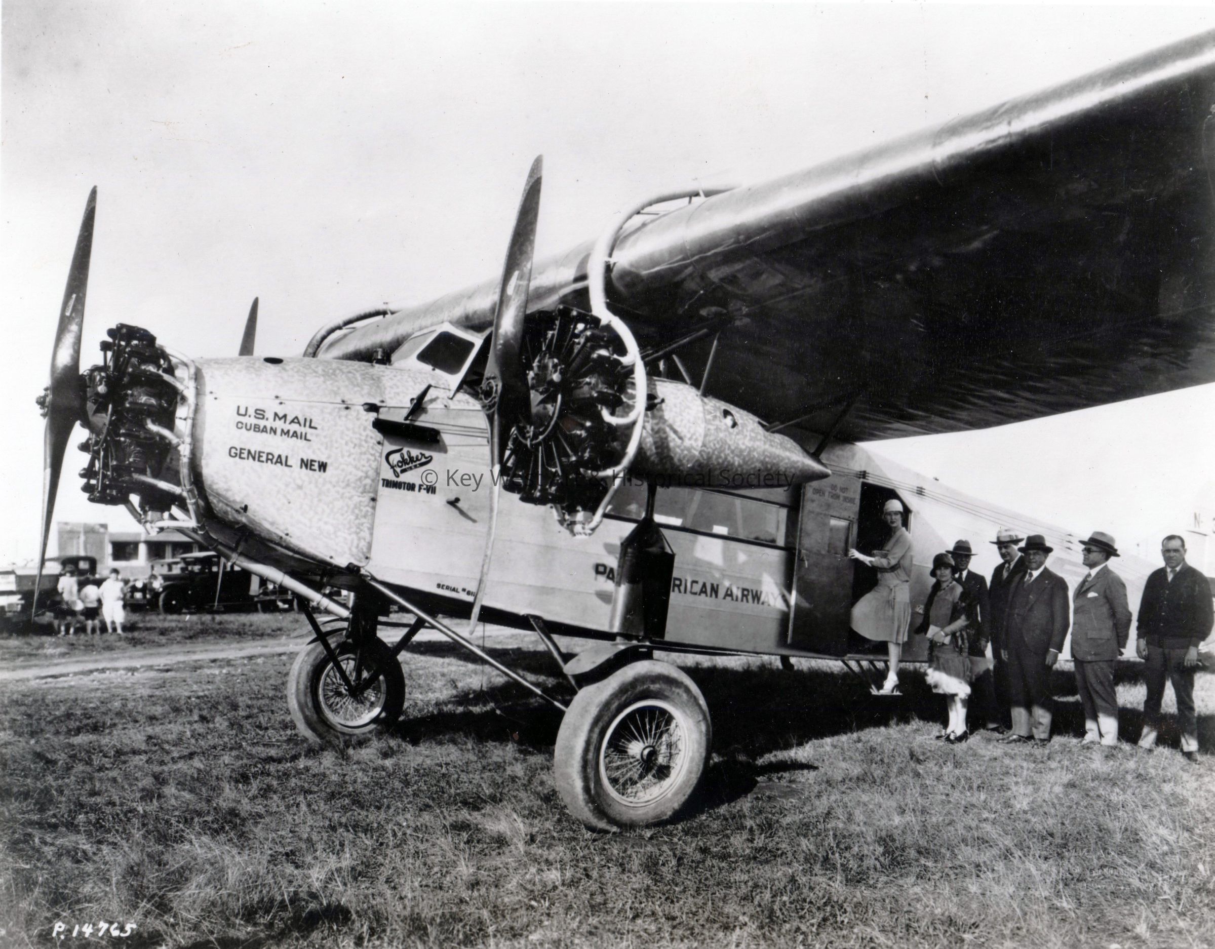 Black and white photograph of the 10-passenger Fokker F-7 aircraft that inaugurated Pan-Am's first passenger flight from Key West to Havana on January 16, 1928. The three engine plane made the 90-mile trip in just about an hour, opening a network that later expanded throughout the Caribbean to South America, across the Pacific, and finally the Atlantic. Plane shown is sister-ship to the 'General Machado', the aircraft that inaugurated the first flight.Photograph Details