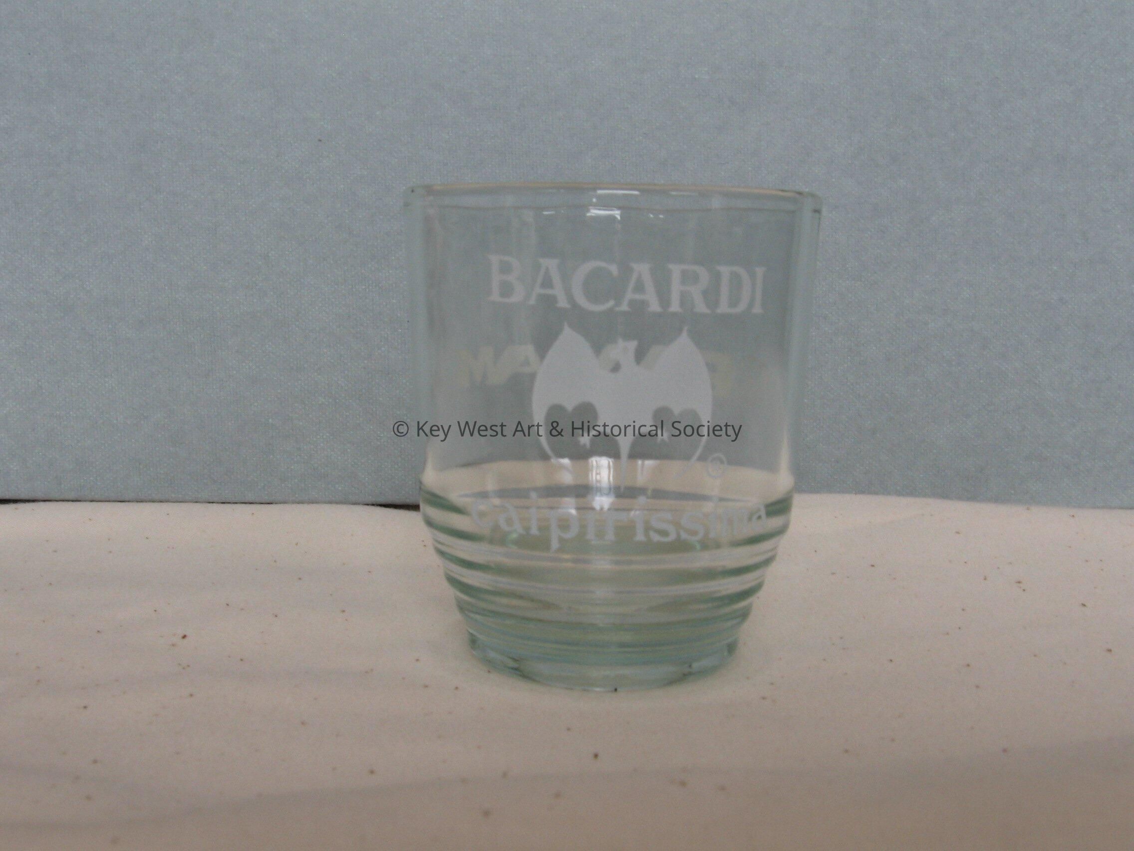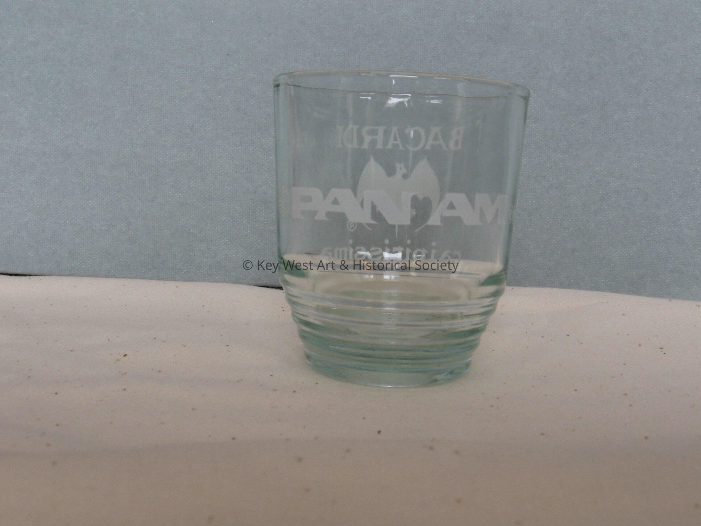 Pan American Airways and Bacardi caipirissima shot glass. 'Pan Am' etched along with Pan Am logo.