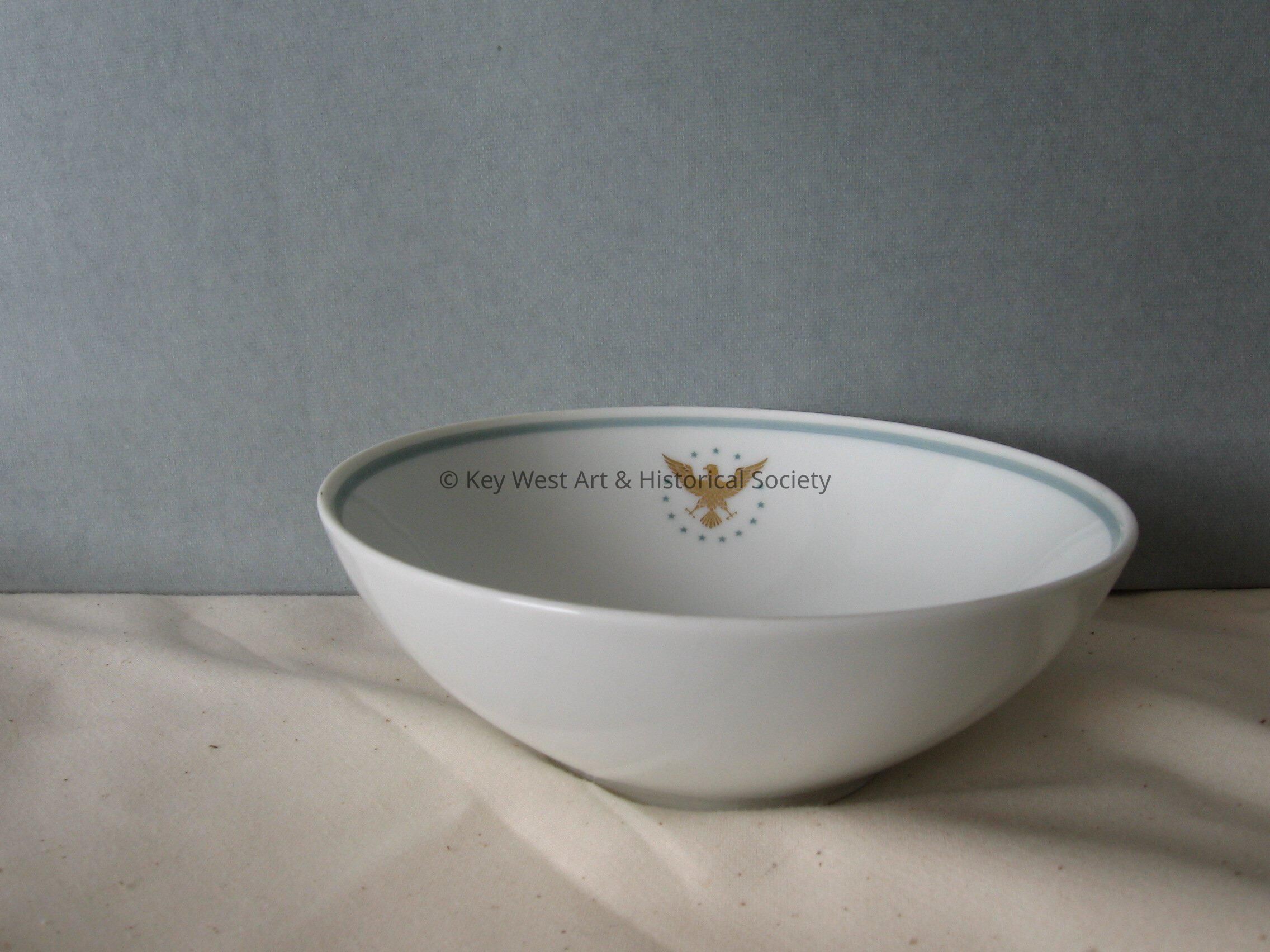 Pan American Airways Noritake china bowl with a light blue stripe around the perimeter. A gold eagle with stars surrounding it printed at the top.Collection