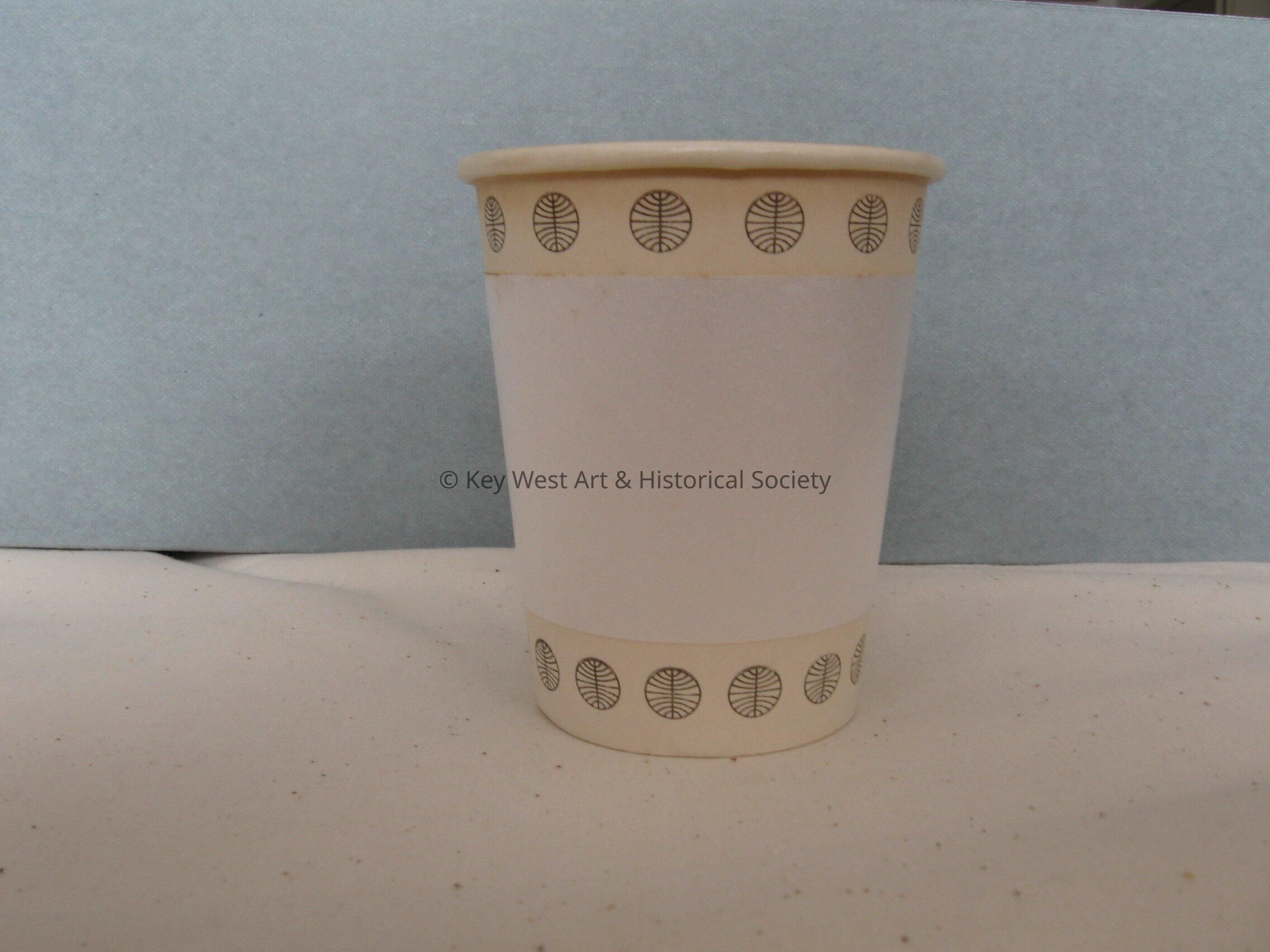 Pan American Airways paper coffee cup with Pan Am logo printed along the bottom and top edges.