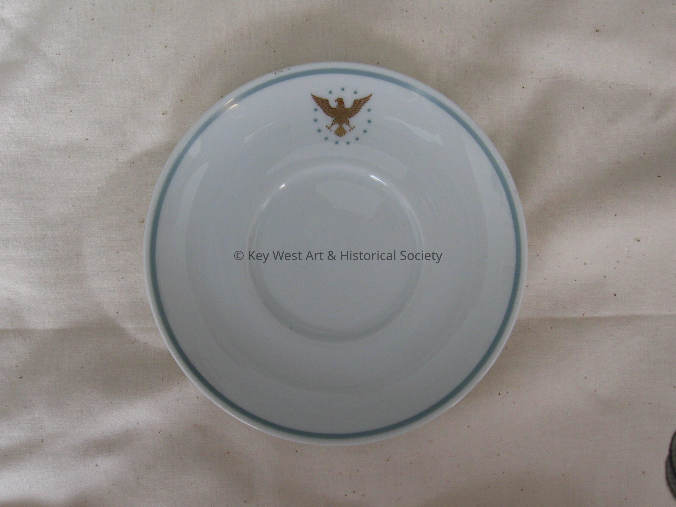 Pan American Airways Noritake china saucer with a light blue stripe around the perimeter. A gold eagle with stars surrounding it printed at the top. Paired with 2003.04.0023H.