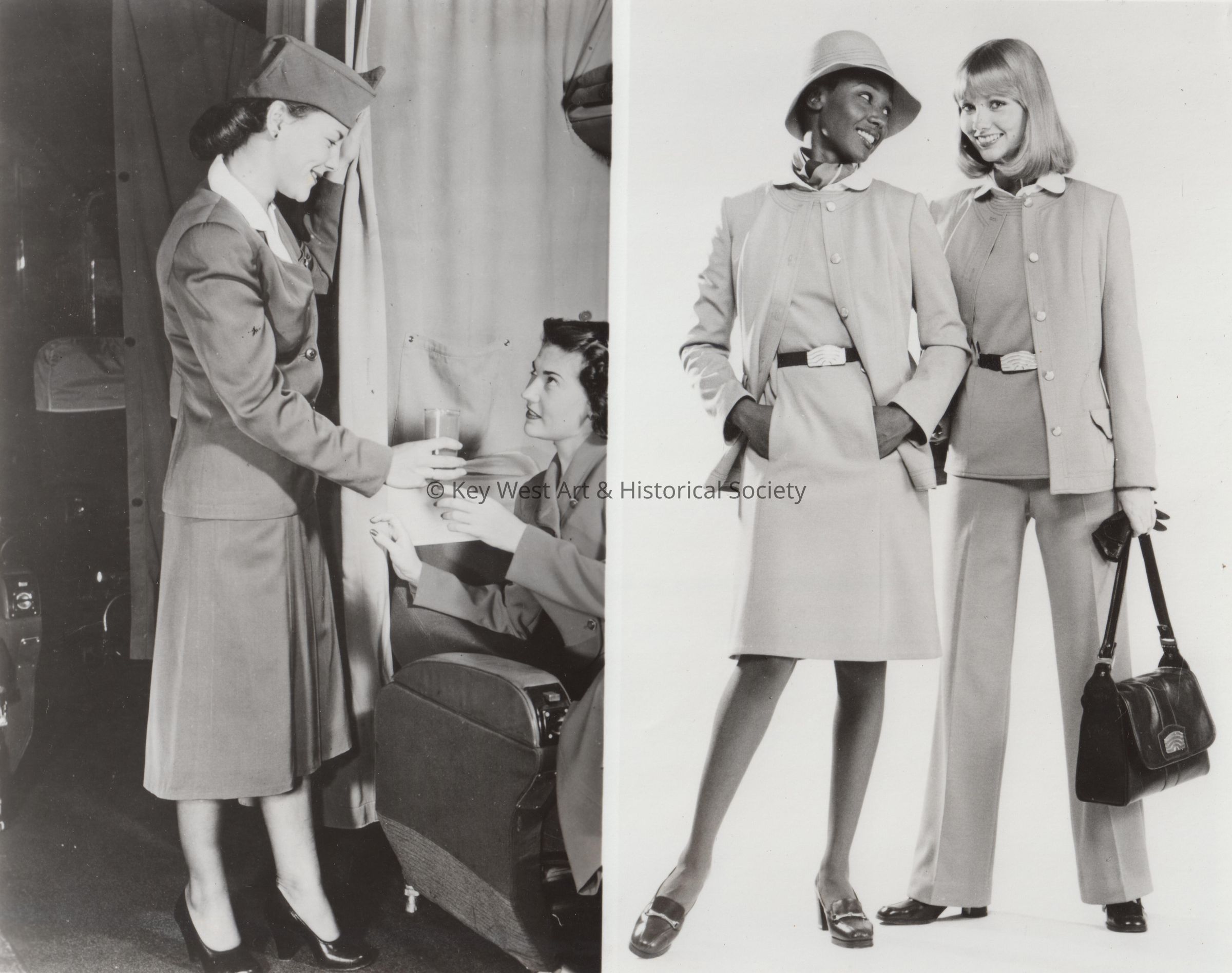 Pan Am stewardess uniforms kept abreast of the contemporary female fashion trends of their times - either the "midi" length of the 1940s as pictured on the left, or the sleek look of the 1970s, shown on the right. Pan American World Airways in 1977 celebrated its 50th Anniversary of international air service.Collection