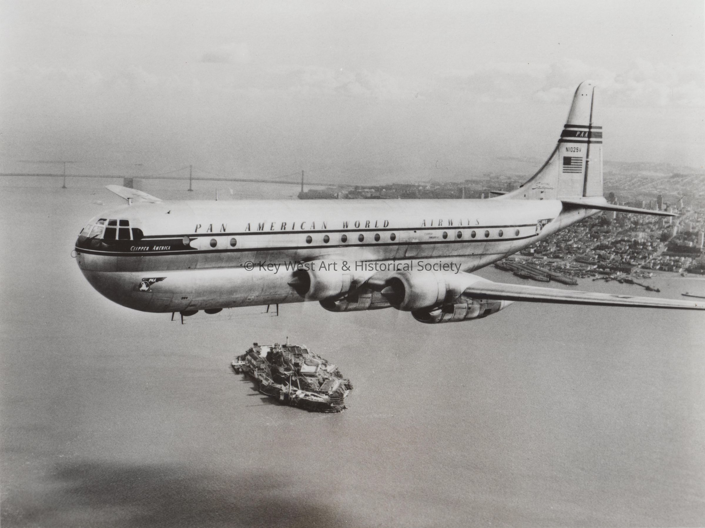 Known affectionately as Queen of the Skies by travelers of the 1950s, this double-decked Pan Am Boeing Stratocruiser was considered by many to be the most luxurious airliner ever built. It carried up to 90 passengers, had a lower-deck cocktail lounge and main-deck sleeping berths that retracted into the ceiling. The "Strat" was introduced to Pan Am's transatlantic routes in 1949 and began transpacific service from San Francisco (pictured here) and other West Coast cities the same year. A special version of the Stratocruiser also allowed the first scheduled nonstop service ever operated from the US to Europe. Pan American World Airways in 1977 celebrated its 50th Anniversary of international air service.Collection