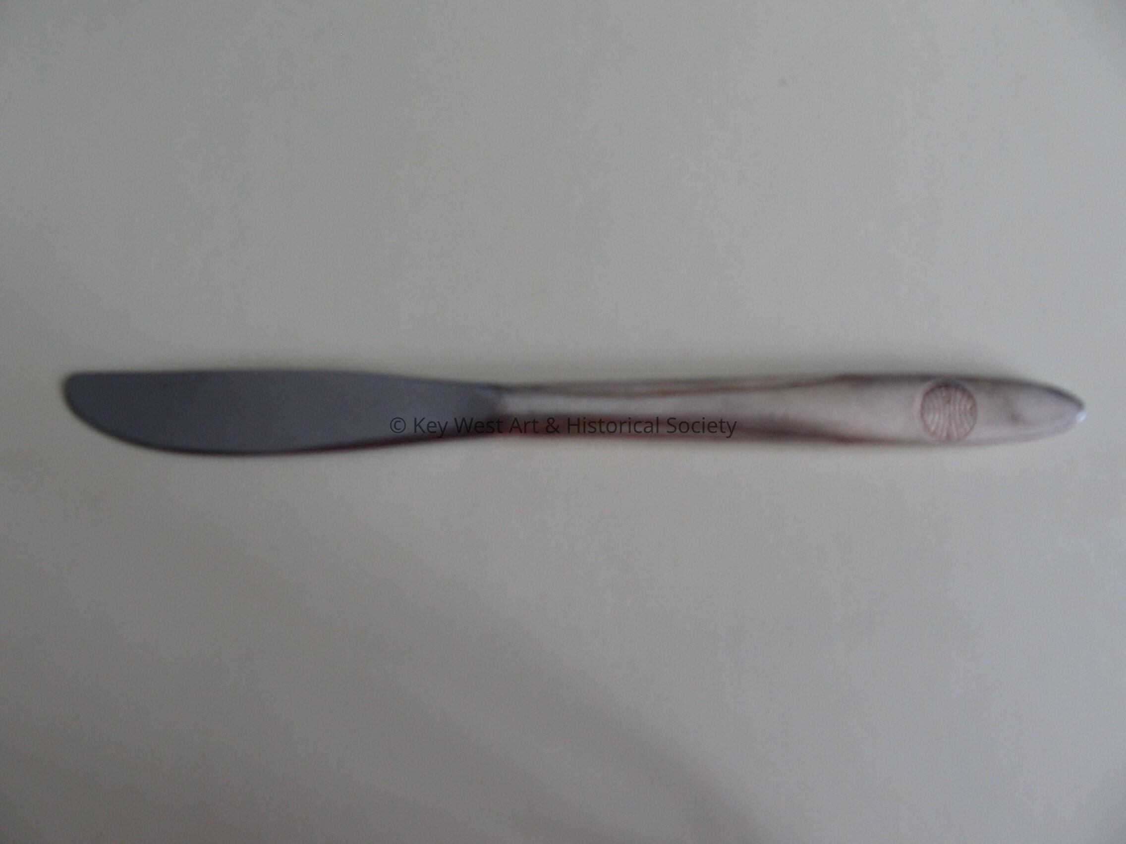 Stainless Steel butter knife with Pan Am logo on the handle used onboard during service.