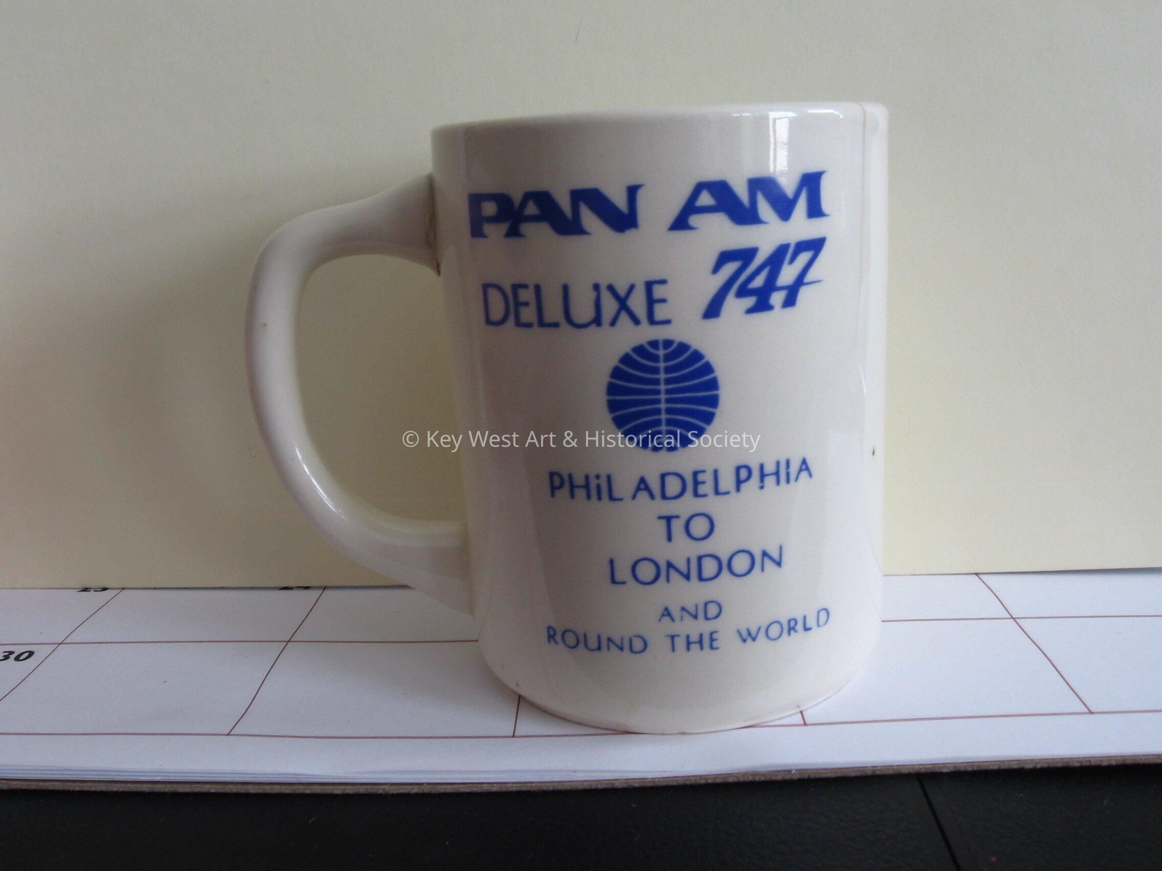 Ceramic Pan Am coffee mug used onboard during service. Text reads, 'Pan Am Deluxe 747, Philadelphia to London and Round the World'.