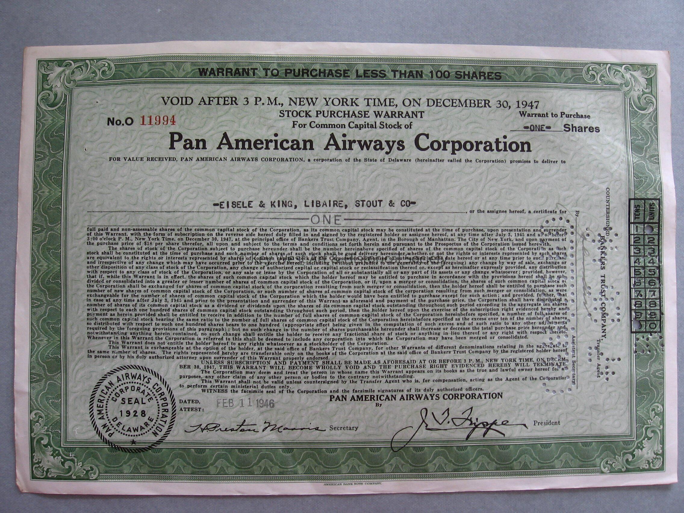 Pan American Airways Corporation 100 shares certificate signed by Juan Trippe.