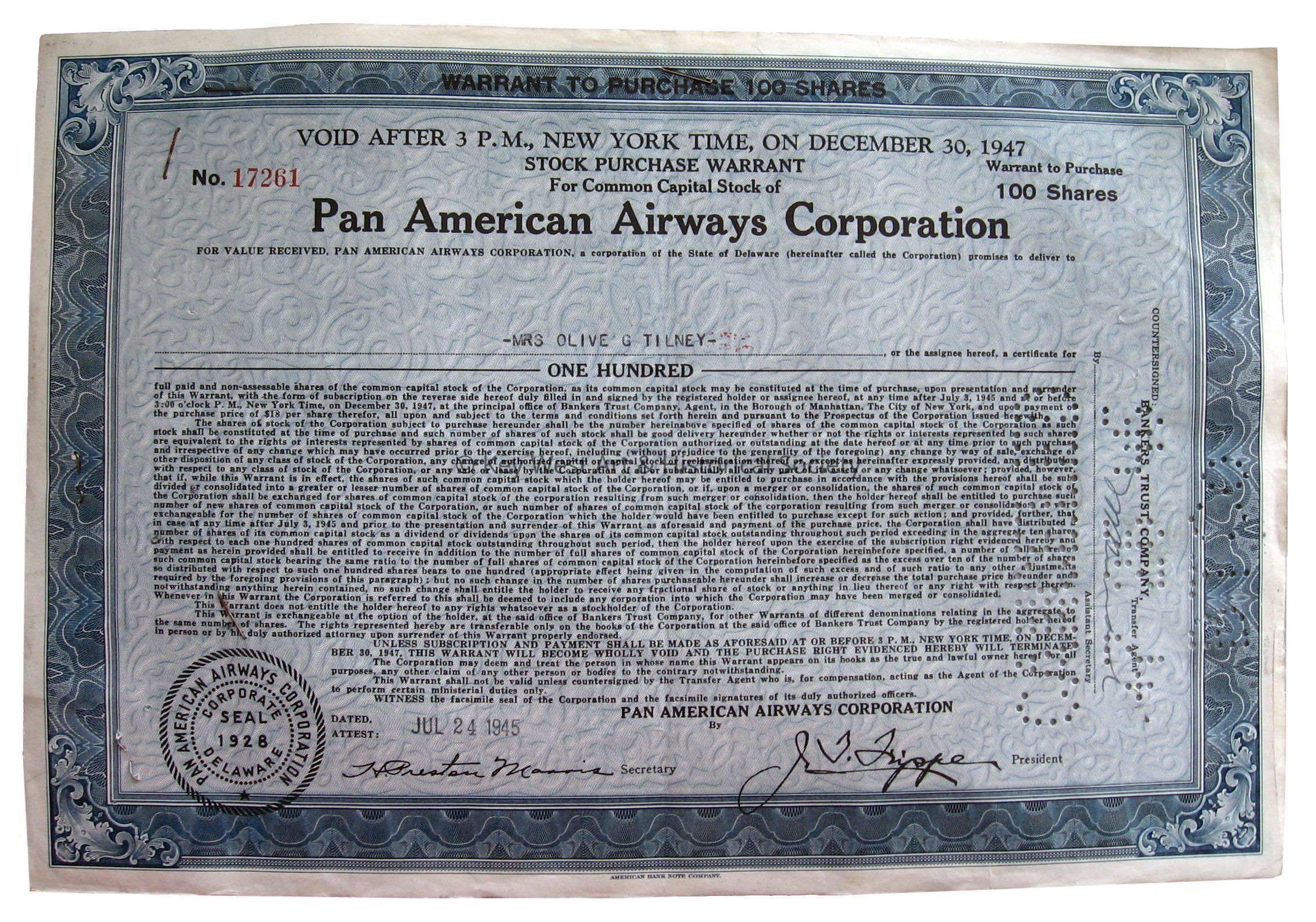 Blue paper Pan American Airways stock certificate for 100 shares purchased by Olive G. Tilney signed by Juan Trippe.