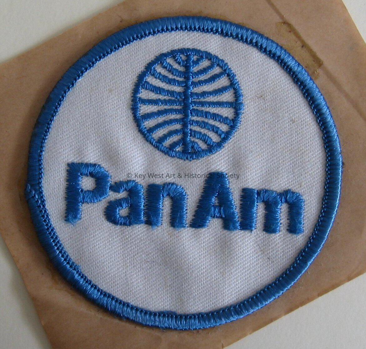 Blue and white Pan Am patch with logo on it. Patch is still on its paper backing.