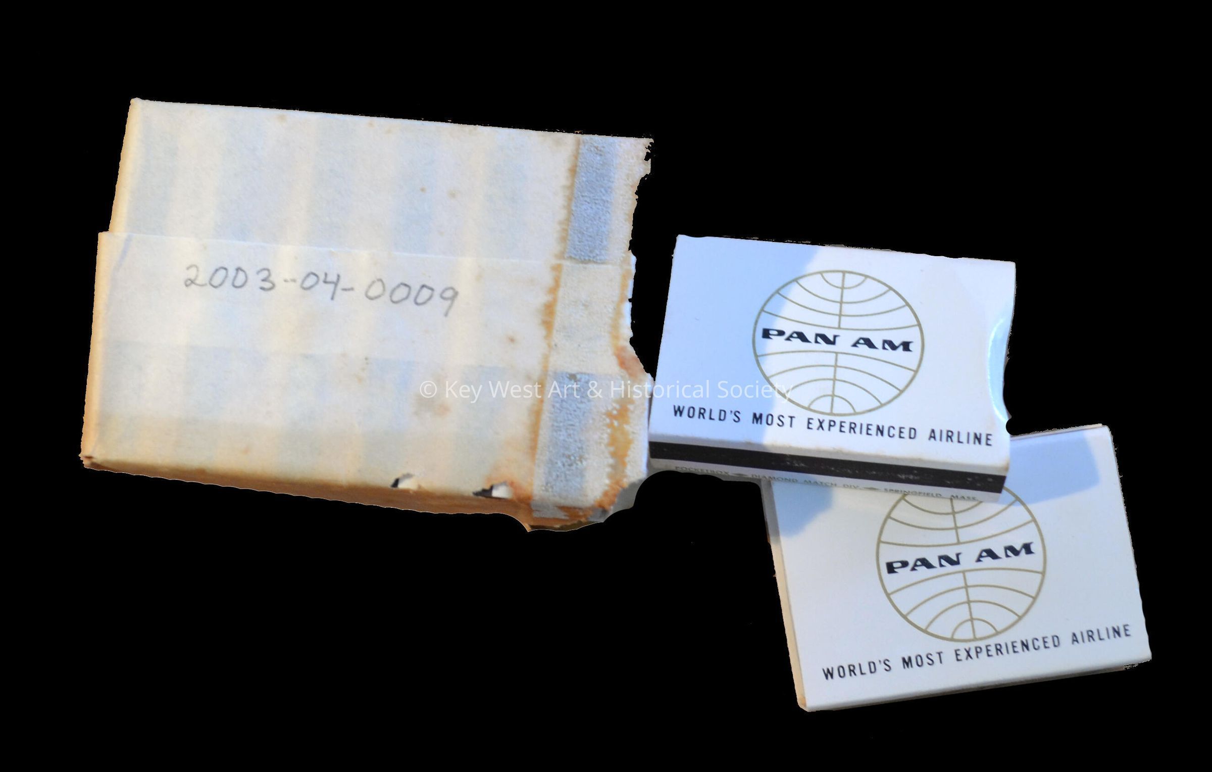 Nine Pan American Airways matchboxes formerly bound together in paper wrapping. Boxes read 'Pan Am World's Most Experienced Airline'. Pan Am logo is on matchbox.Collection