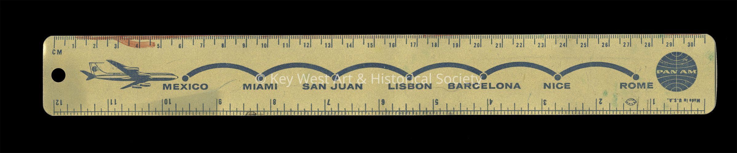 Pan American Airways metal 12-inch ruler with logo. Also depicted is an airplane and a list of cities and countries (Mexico, Miami, San Juan, Lisbon, Barcelona, Nice, and Rome).Collection
