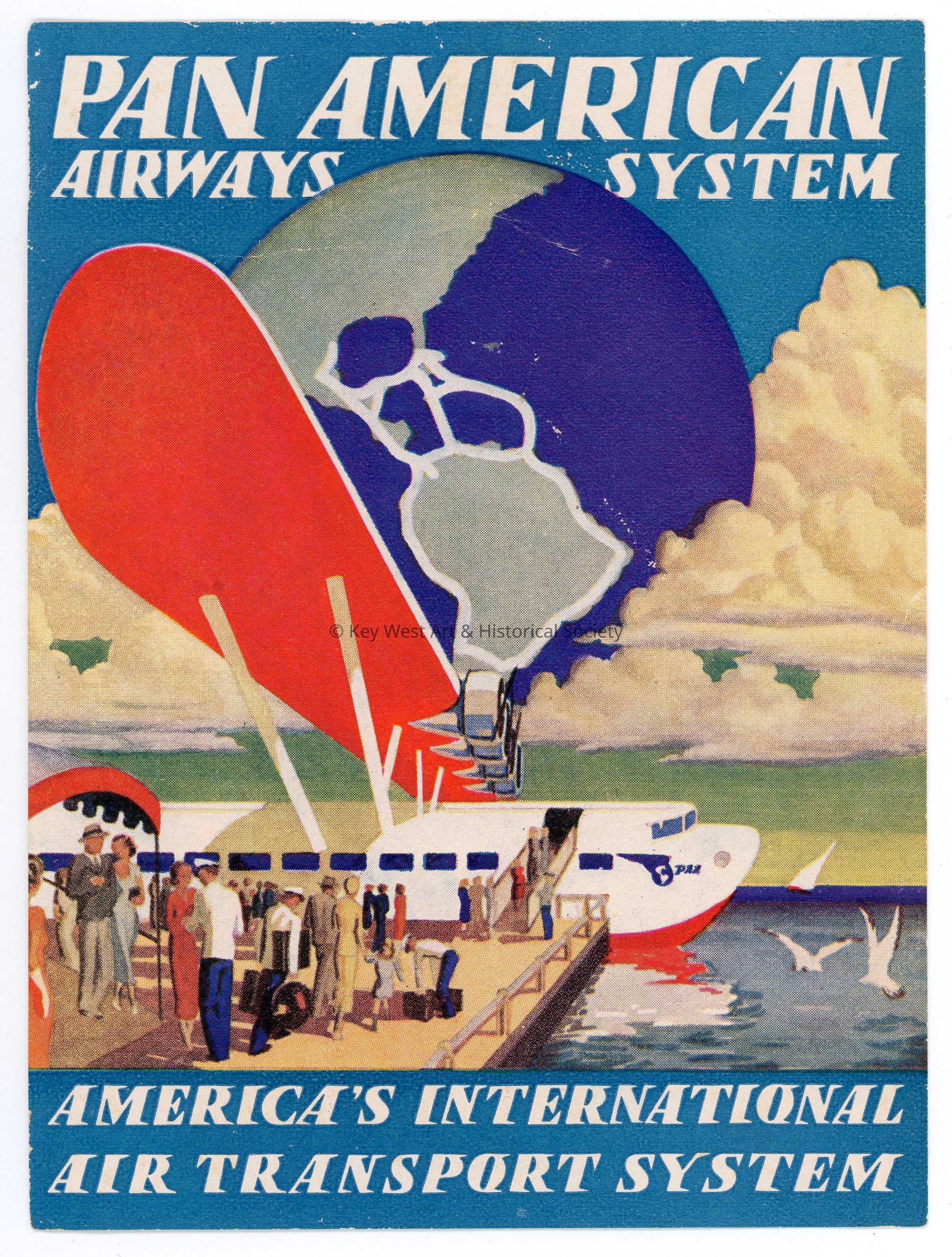 A predominantly blue, red, and white sticker for the Pan American Airways System, 'AMERICA'S INTERNATIONAL AIR TRANSPORT SYSTEM.' The sticker has a globe showing North and South America with Pan Am's routes highlighted in white. Below the globe is a line of people boarding a flying boat.Collection
