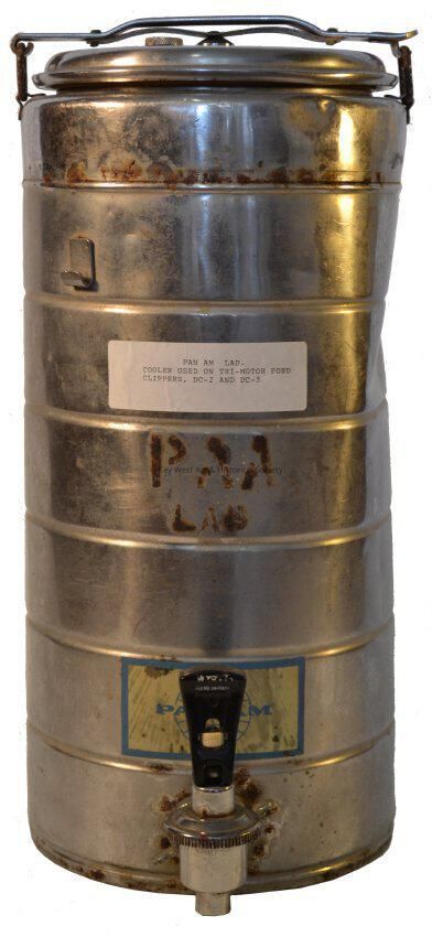 Portable stainless steel water cooler used by flight crew onboard Pan American Airways. Pan Am logo above spigot. PAA LAD (Pan American Airlines Latin American Division) is engraved on the body of the cooler.