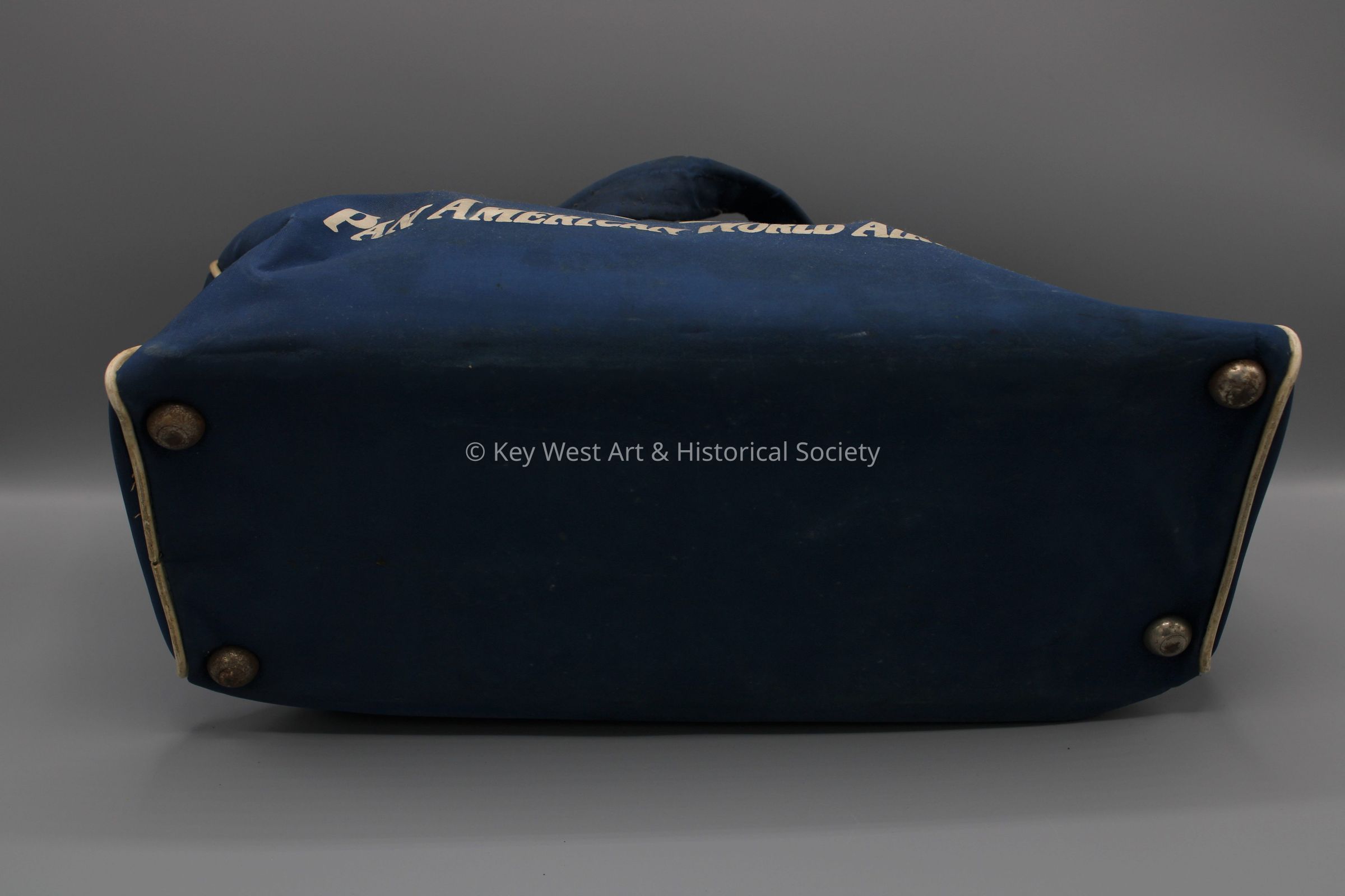 Blue vinyl Pan Am World Airways travel bag. Zippered closure with two short straps and four small metal feet on the base of the tote.Collection