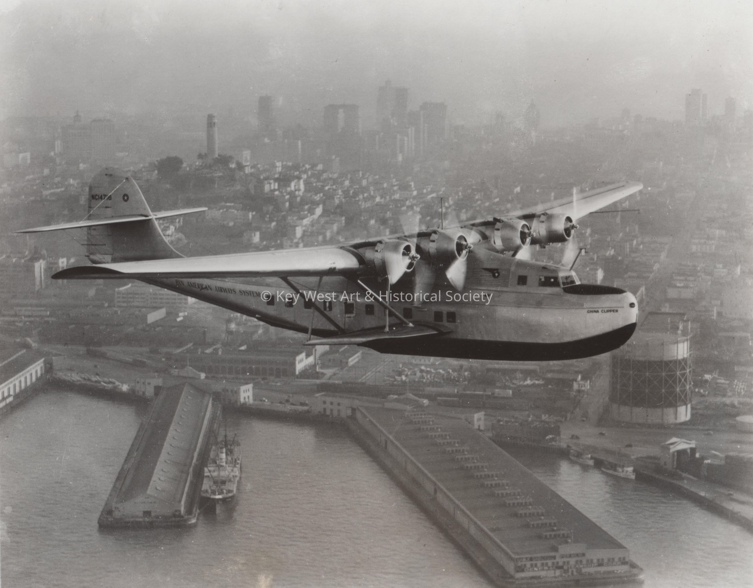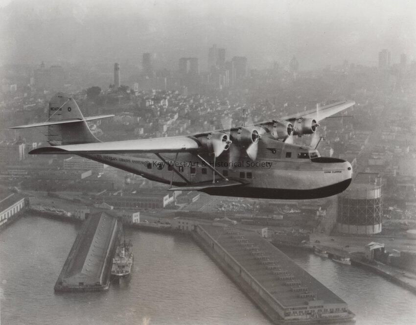 Pan Am's China Clipper flying boat passes over the San Francisco waterfront at the start of its historic first airmail flight to Manila on November 22, 1935. The Martin M-130 made the trip in six days and a flying time of 59 hours, 48 minutes, with overnight stops in Honolulu, Midway, Wake, and Guam Islands. In the 1970s, Pan Am's 747 Clippers flew from San Francisco to Manila in less than 16 hours. Pan American World Airways in 1977 celebrated its 50th Anniversary of international air service.Collection