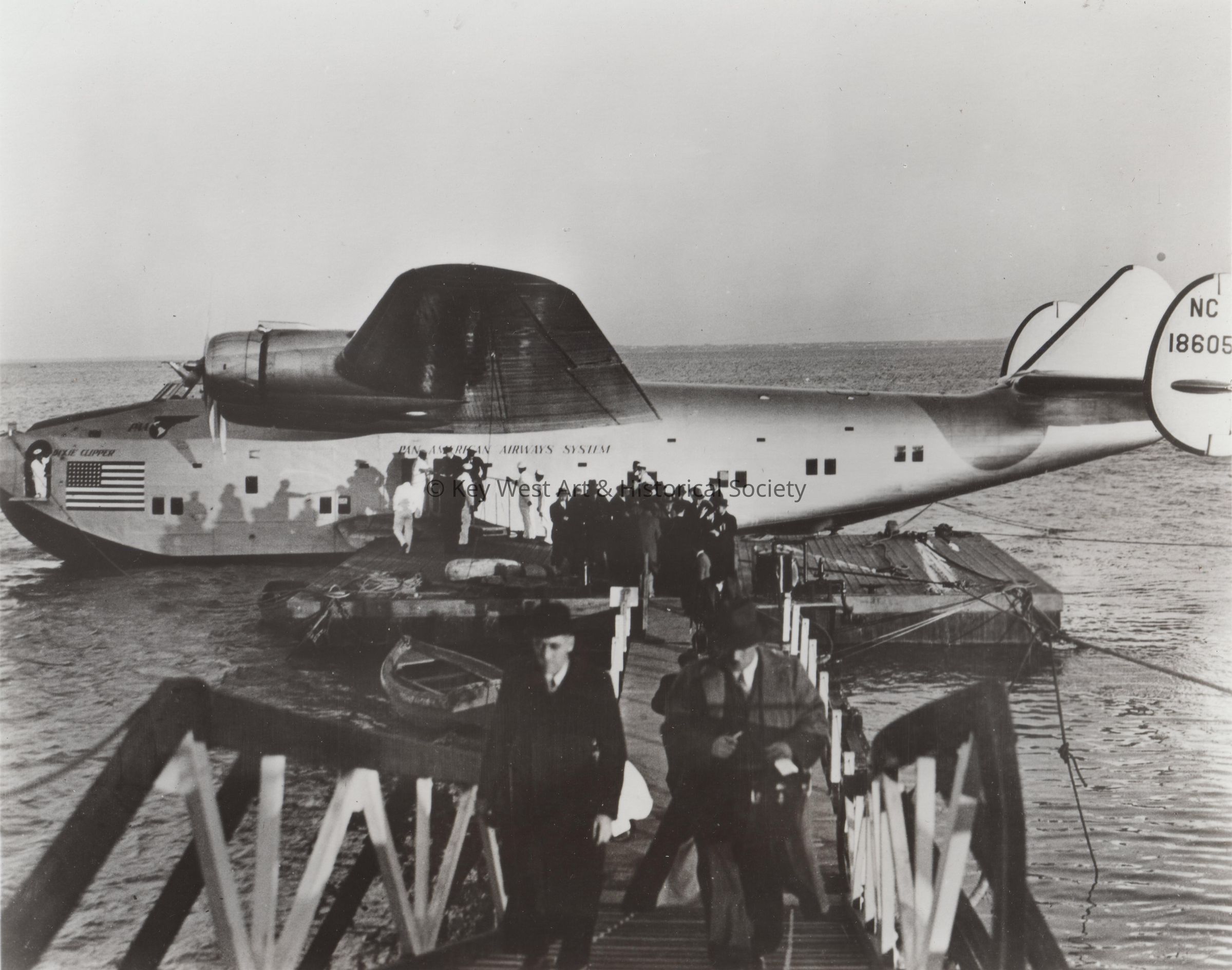 Passengers disembark from Pan Am's Dixie Clipper after its historic first transatlantic flight, from Port Washington near New York City to Lisbon on June 28-29, 1939. The luxurious Boeing 314 flying boat completed the trip in 24 hours, 15 minutes with a refueling stop in the Azores. It continued from Lisbon to Marseilles. In the 1970s, Pan Am's 747 Clippers crossed the Atlantic nonstop in little more than six hours. Pan American World Airways in 1977 celebrated its 50th Anniversary of international air service.Collection