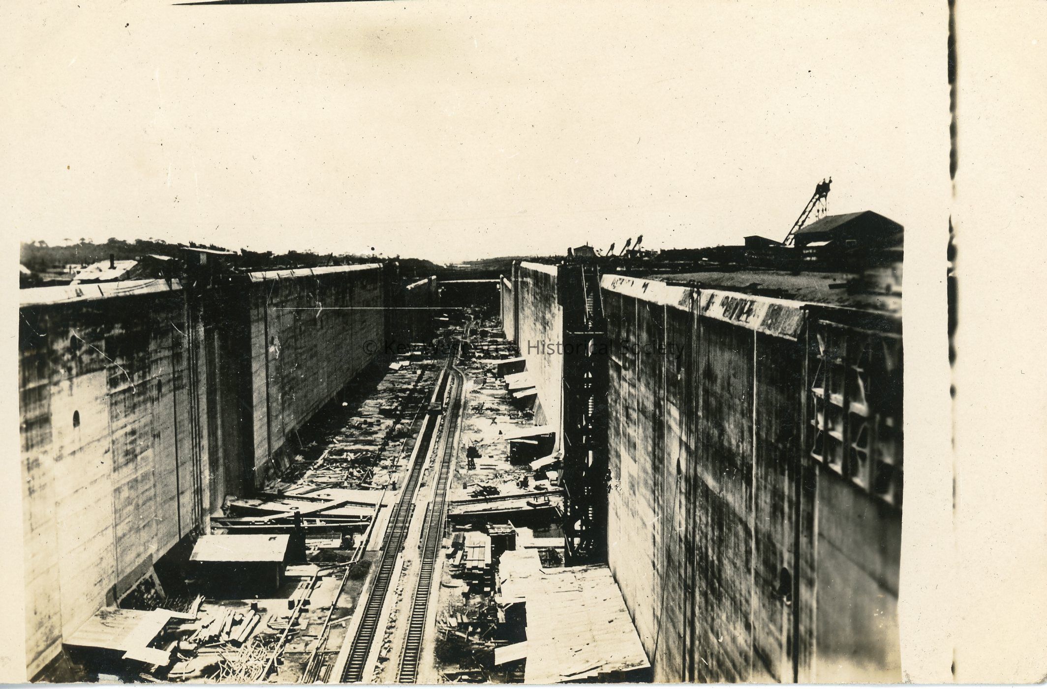 Black and white photograph postcard depicting the construction of the Panama Canal. The photo shows the concrete walls of a lock with railroad tracks used to transport construction equipment between them. The postcard is addressed to Mrs. G.A. Balling.Subject