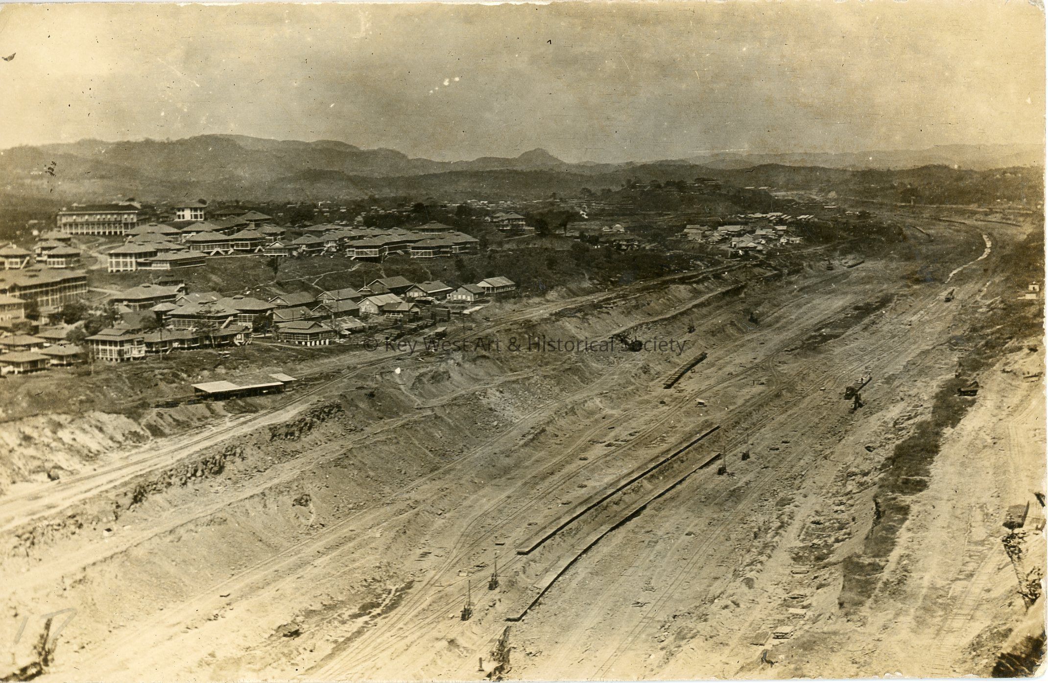 Black and white photograph postcard depicting the construction of the Panama Canal. A large trench is in the foreground with a community in the background.Subject