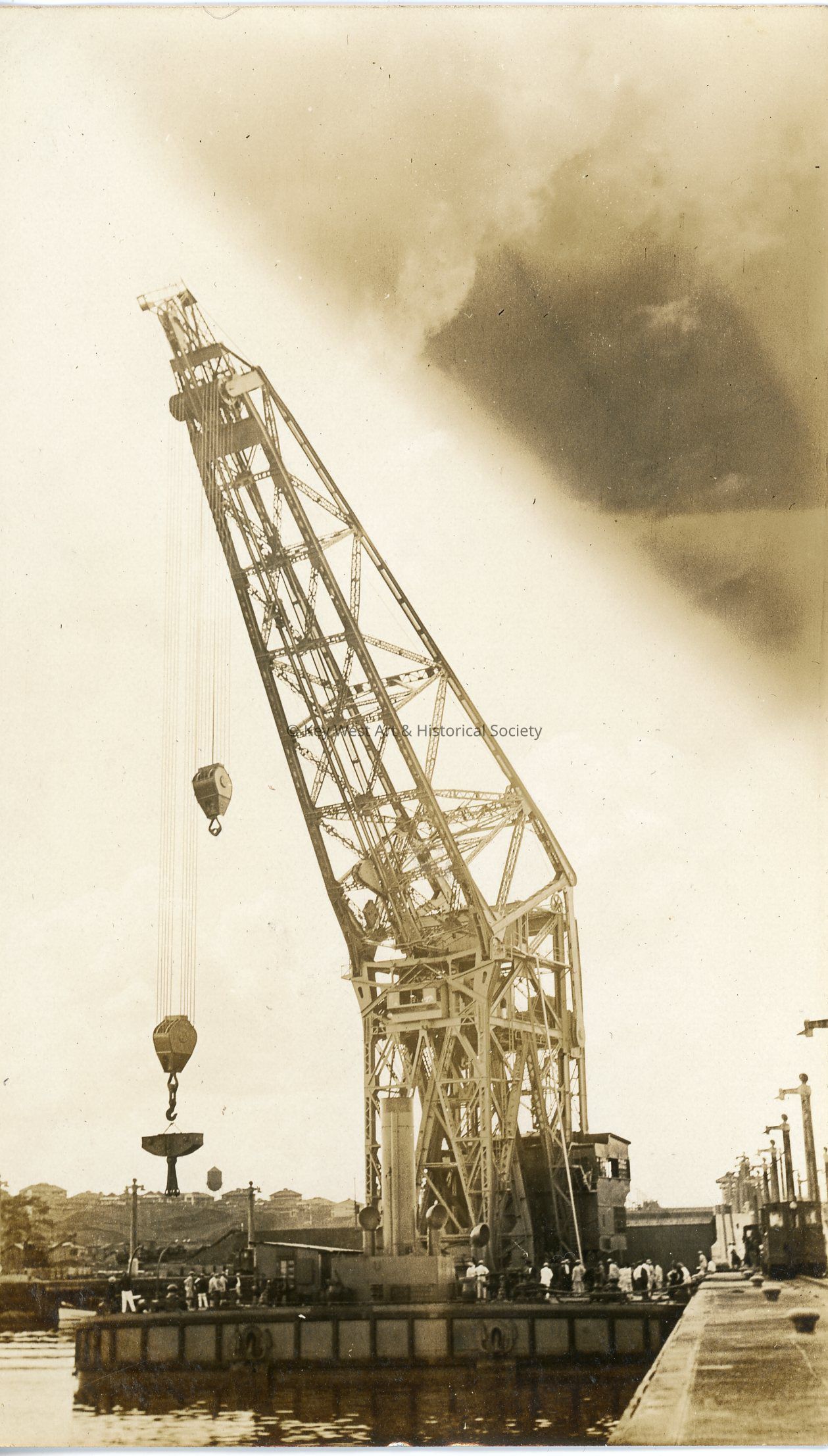Black and white photograph depicting the construction of the Panama Canal. The photograph shows a large crane with people standing below. This photo was likely taken at the Gatun Locks. The photograph was designed to be attached to a postcard backing.