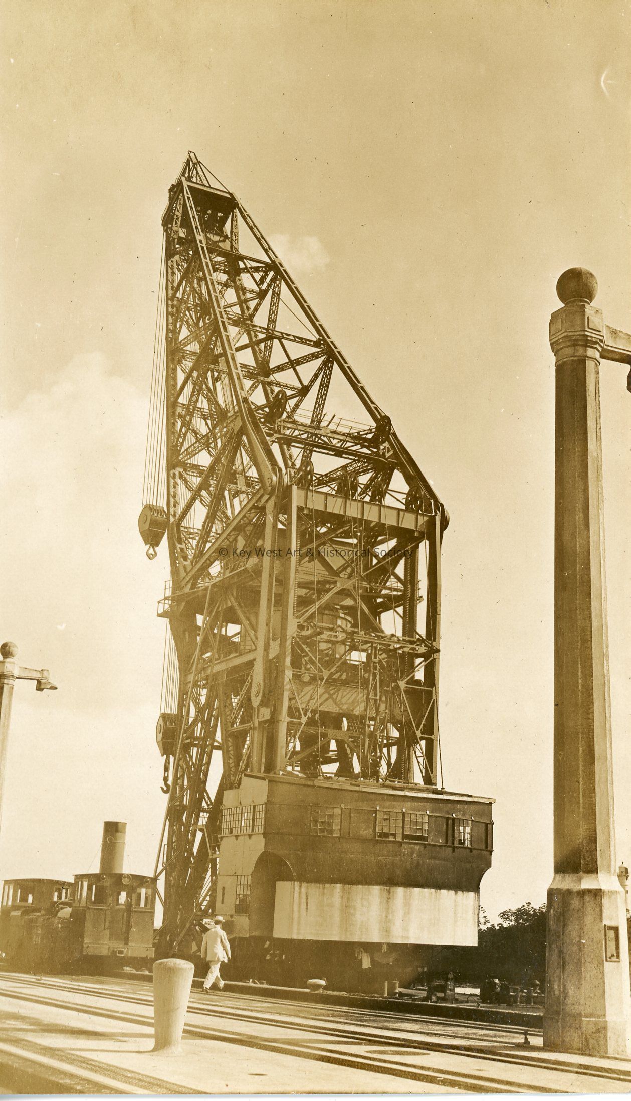 Black and white photograph depicting the construction of the Panama Canal. The photograph shows a large crane with a train car below. This photo was likely taken at the Gatun Locks. The photograph was designed to be attached to a postcard backing.